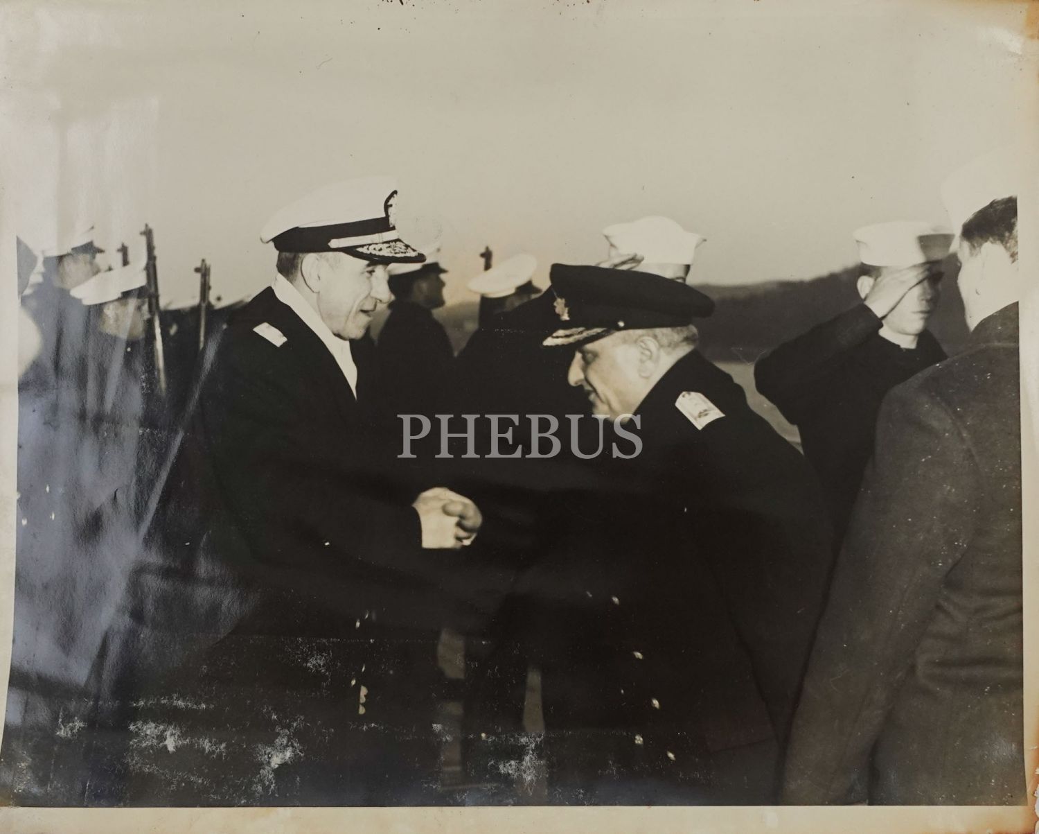 "Türk Deniz Kuvvetleri Başkomutanı Tümamiral Rıdvan Koral, bugün limanımıza gelen Newport News Kruvazöründe, Altıncı Amerikan Filosu Komutanı Koramiral John J. Ballentine´ı iadei ziyaret etmiştir. Resim, Tümamiral Rıdvan Koral´ı, gemide Amiral Ballentine tarafından karşılanırken gösteriyor", 26x20 cm...