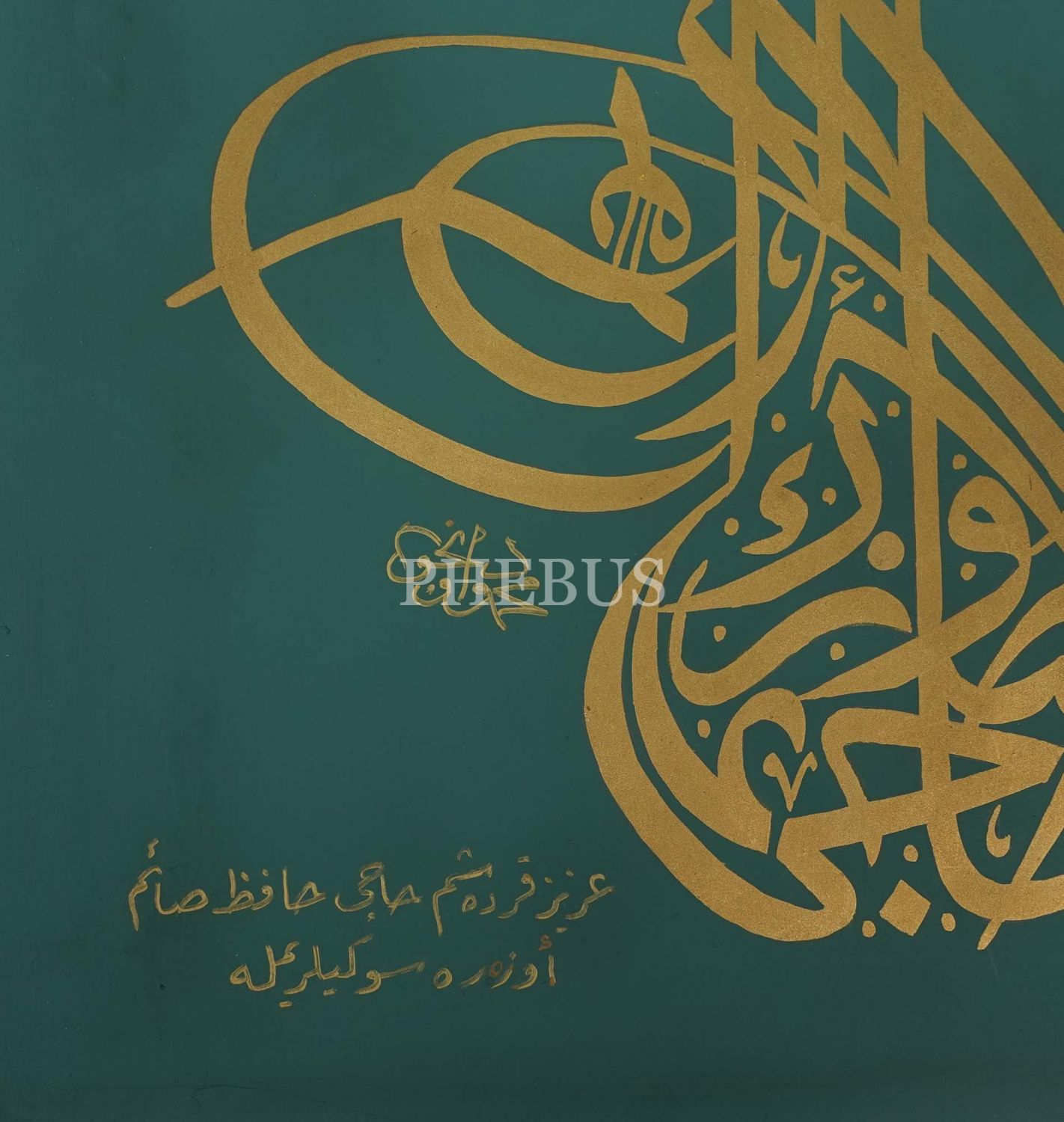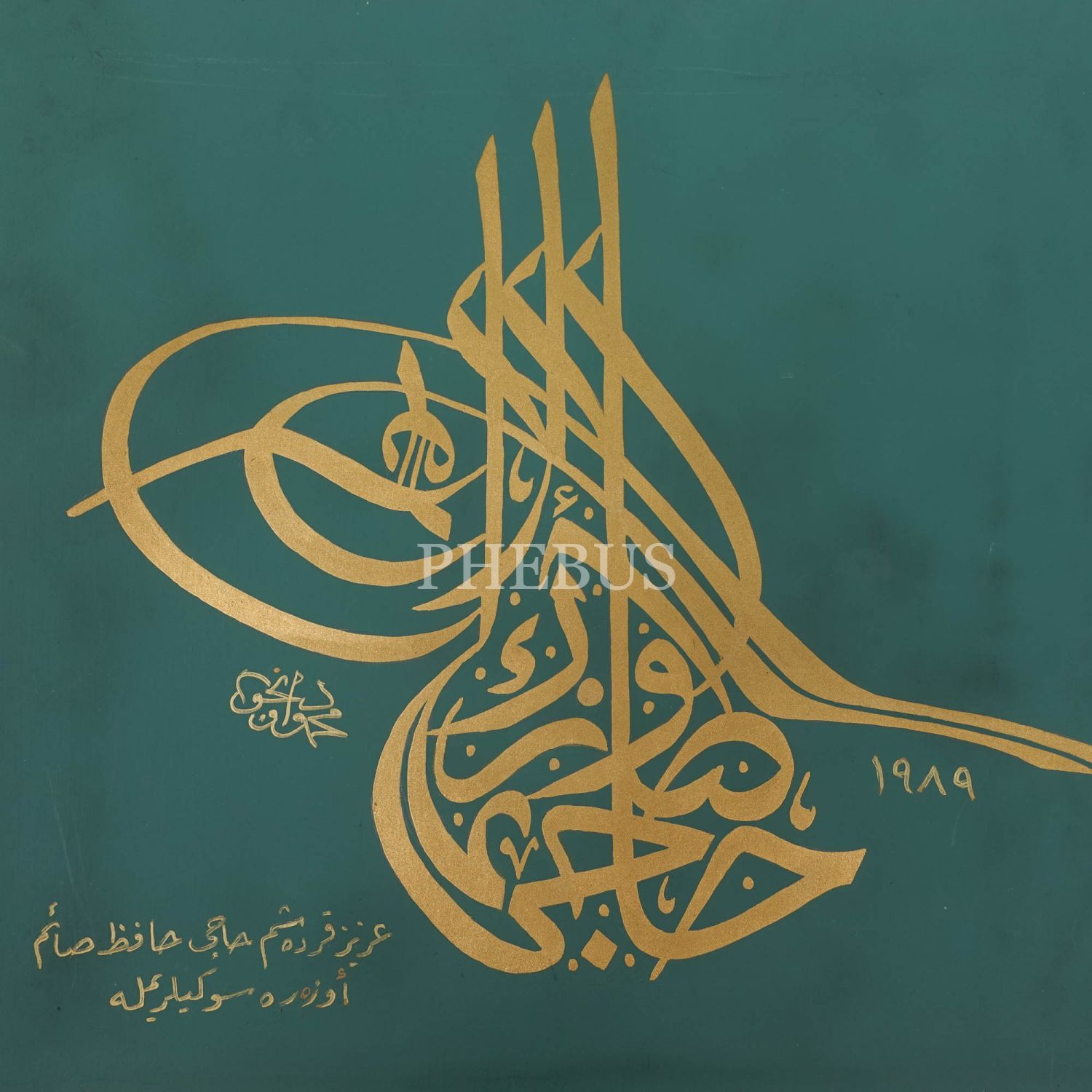 Mahmud Öncü ketebeli "Hacı Saim Özer" yazılı tuğra, 1989 tarihli, 42x35 cm...