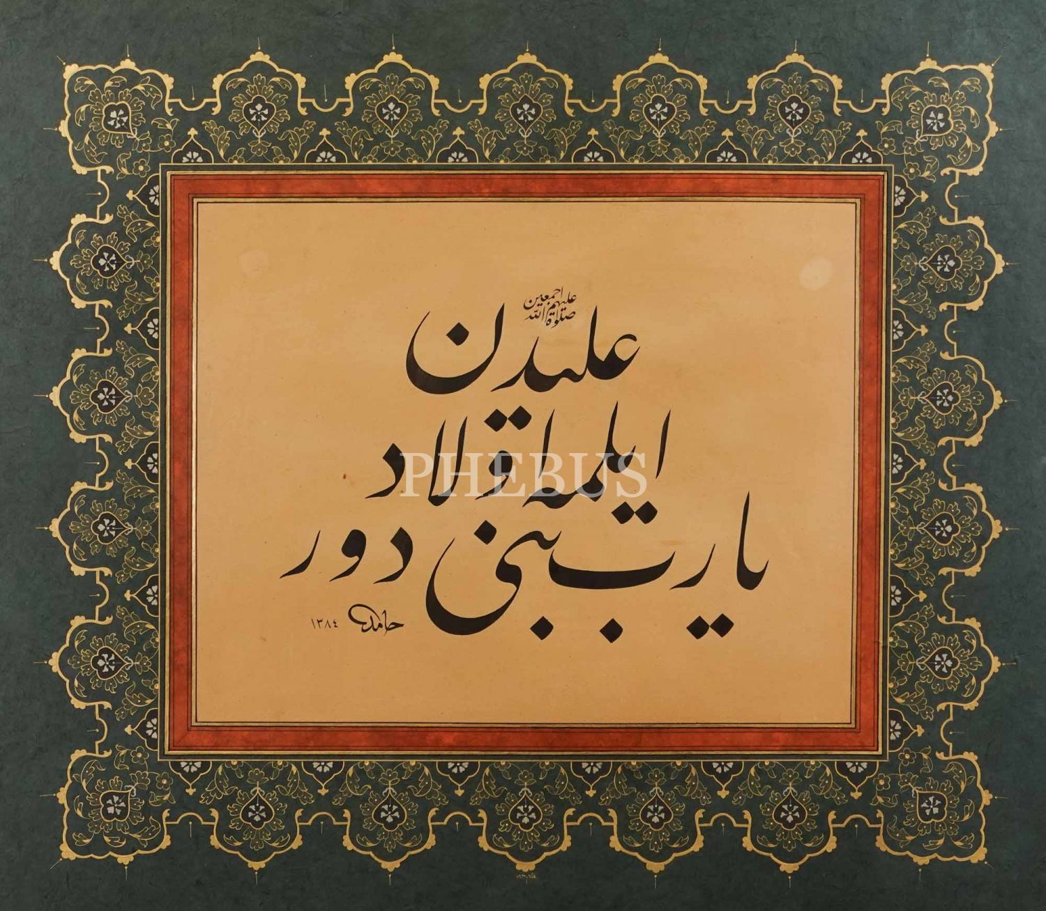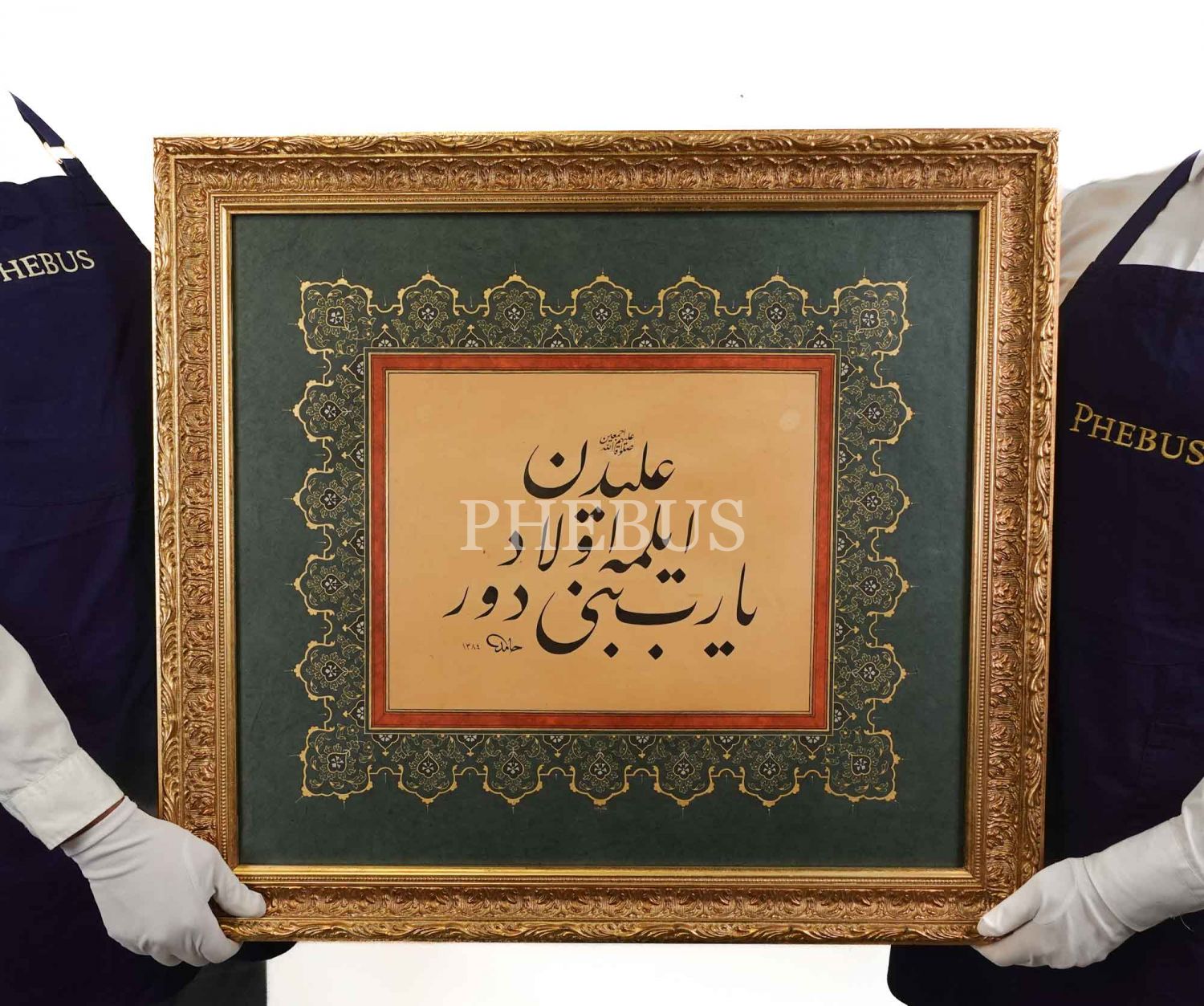 Hasan Çelebi ketebeli celi sülüs müsenna levha, "Hû Allah", 1399 tarihli, çerçeve ölçü: 52x49 cm...