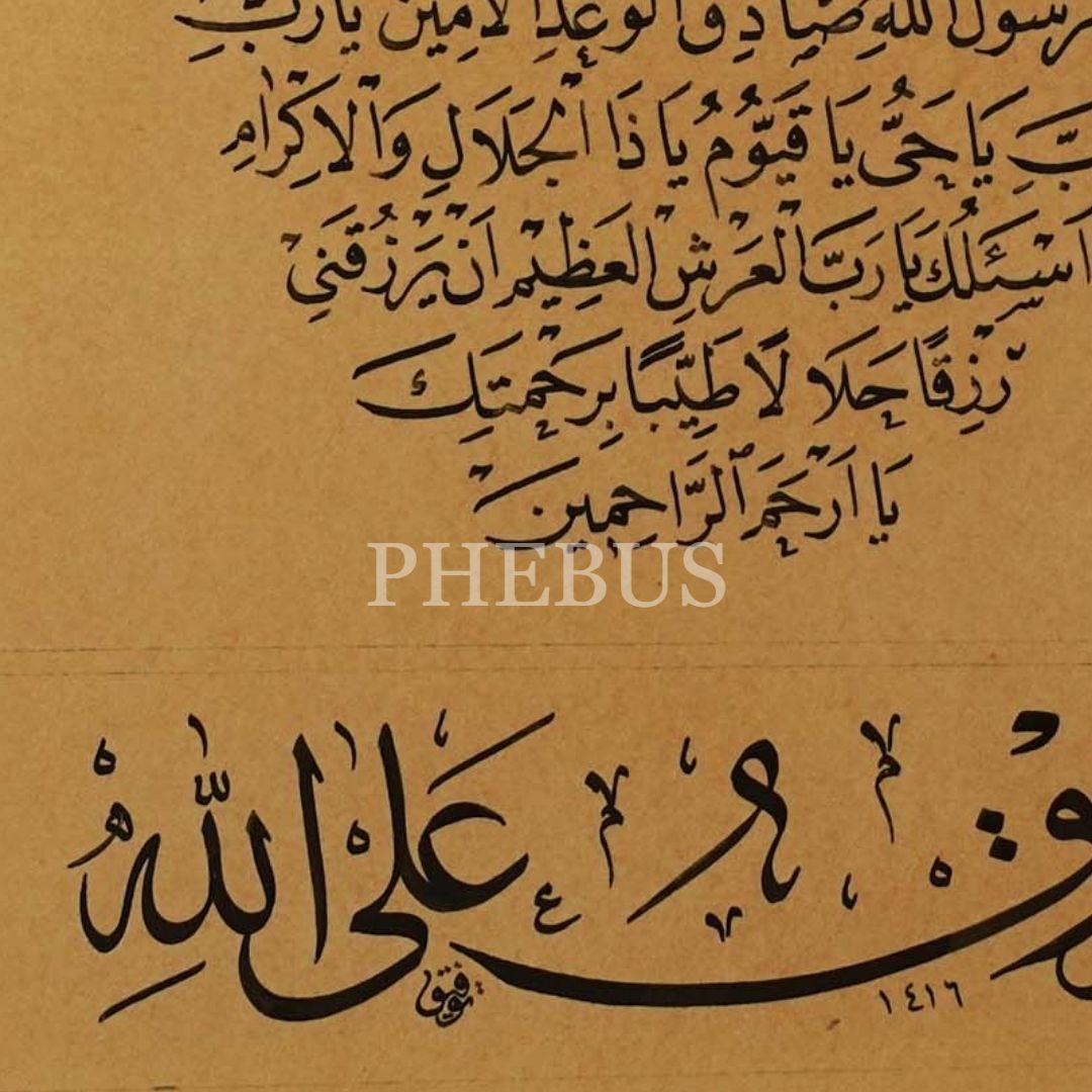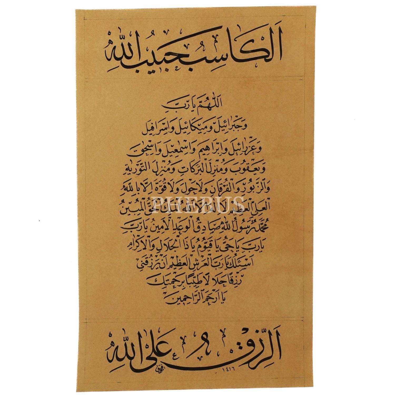 Sülüs kısımlarda "Çalışıp kazanan Allah´ın dostudur." ve "Rızık Allah´tandır."; nesih kısımda bereket duası yazmaktadır.