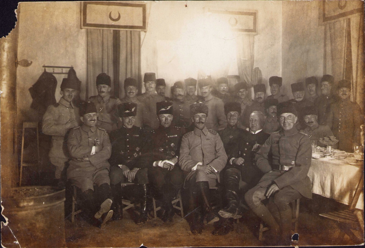 1. Cihan Harbi Çanakkale, Hilal-i Ahmer amblemli sofra başı hatıra fotoğrafı, Çanakkale madalyalı Osmanlı pilotlar, haliyle.