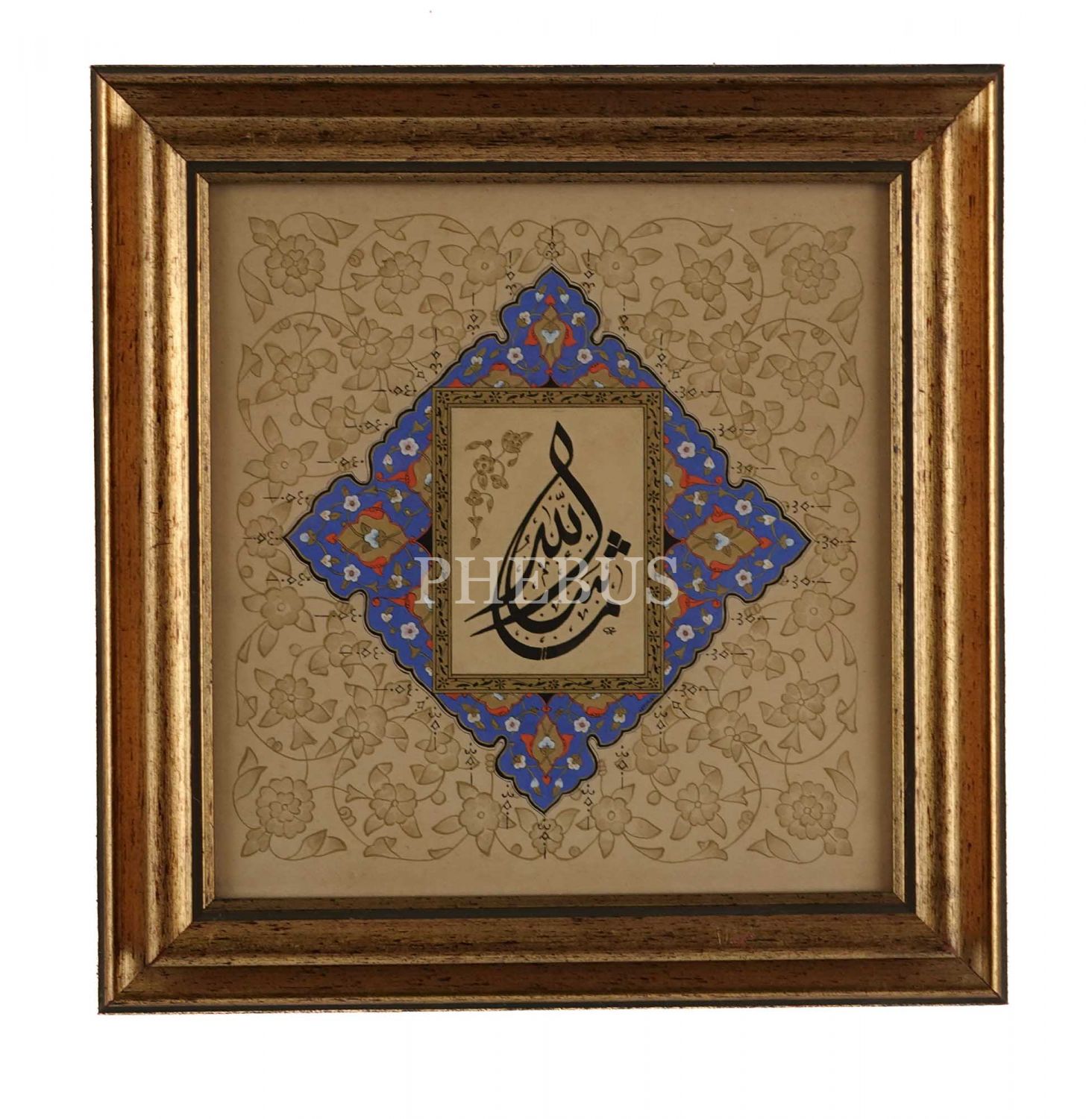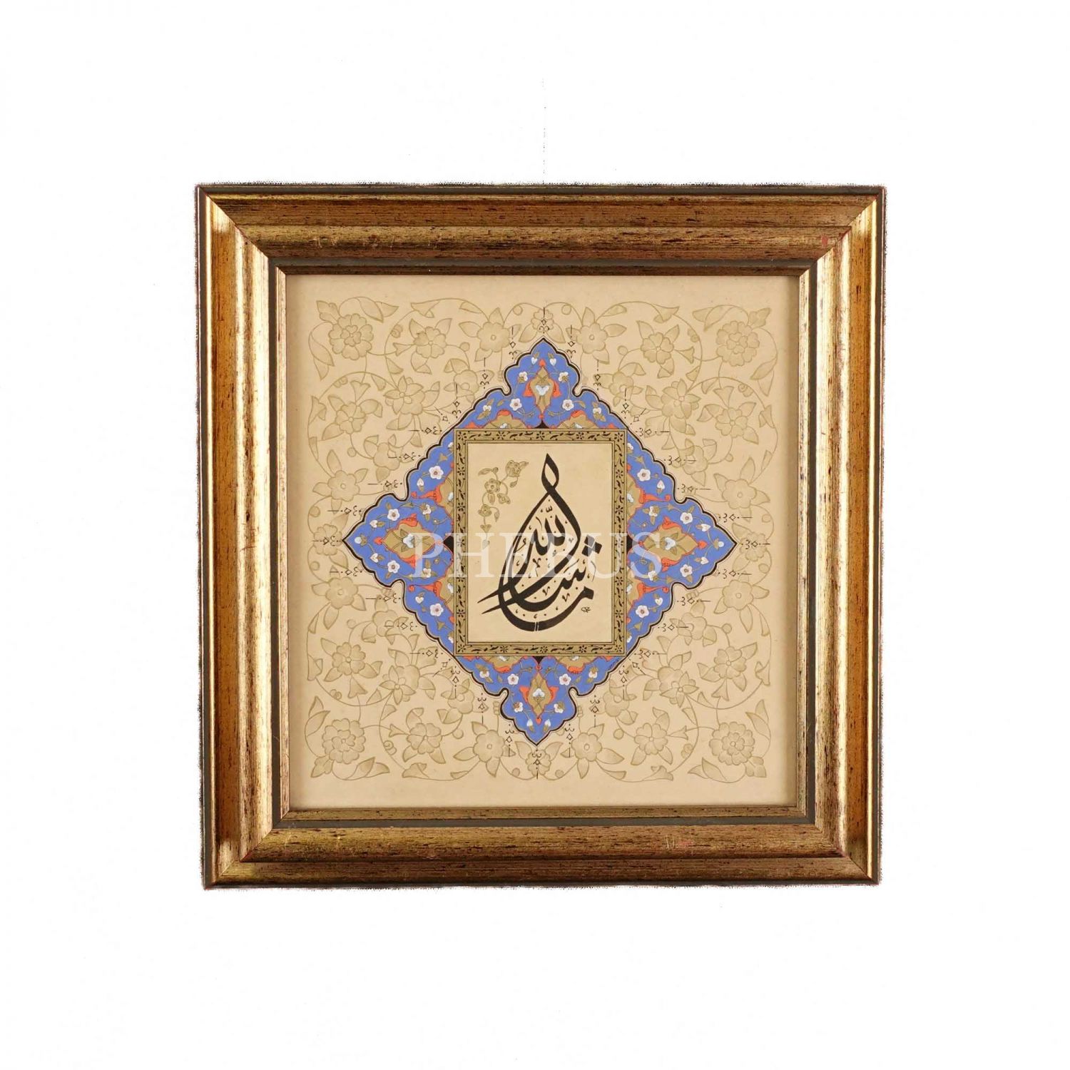 Mehmet Memiş ketebeli celi divani "Maşallah", klasik tarzda altın tezhipli, çerçeve ölçü: 30x30 cm....