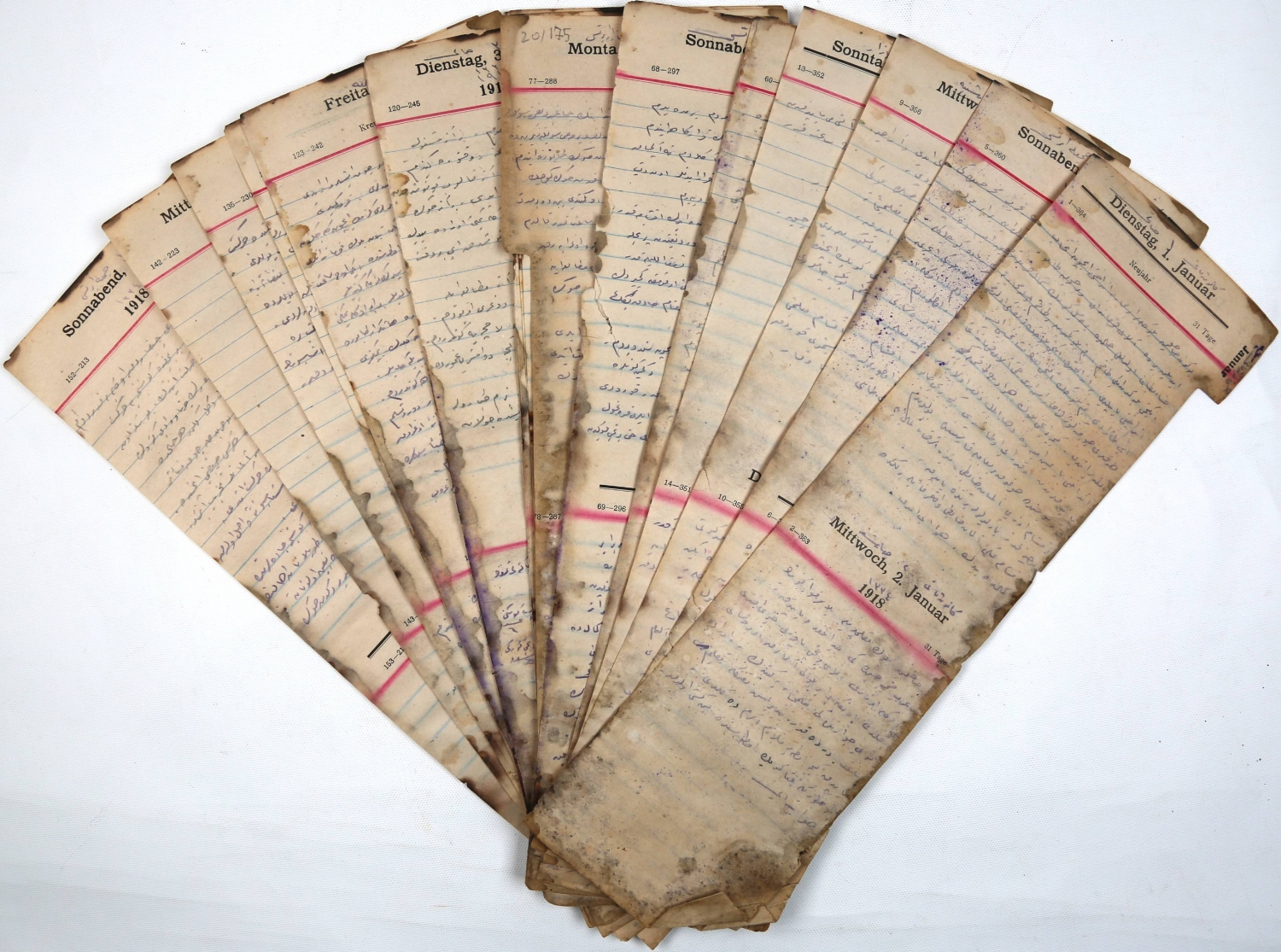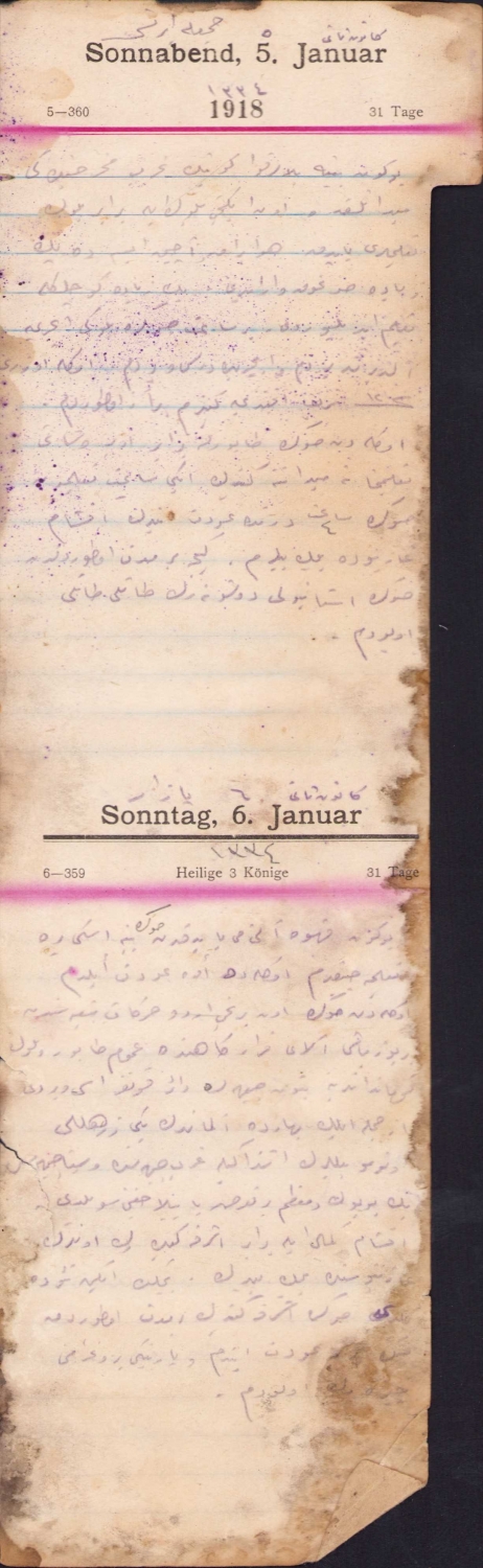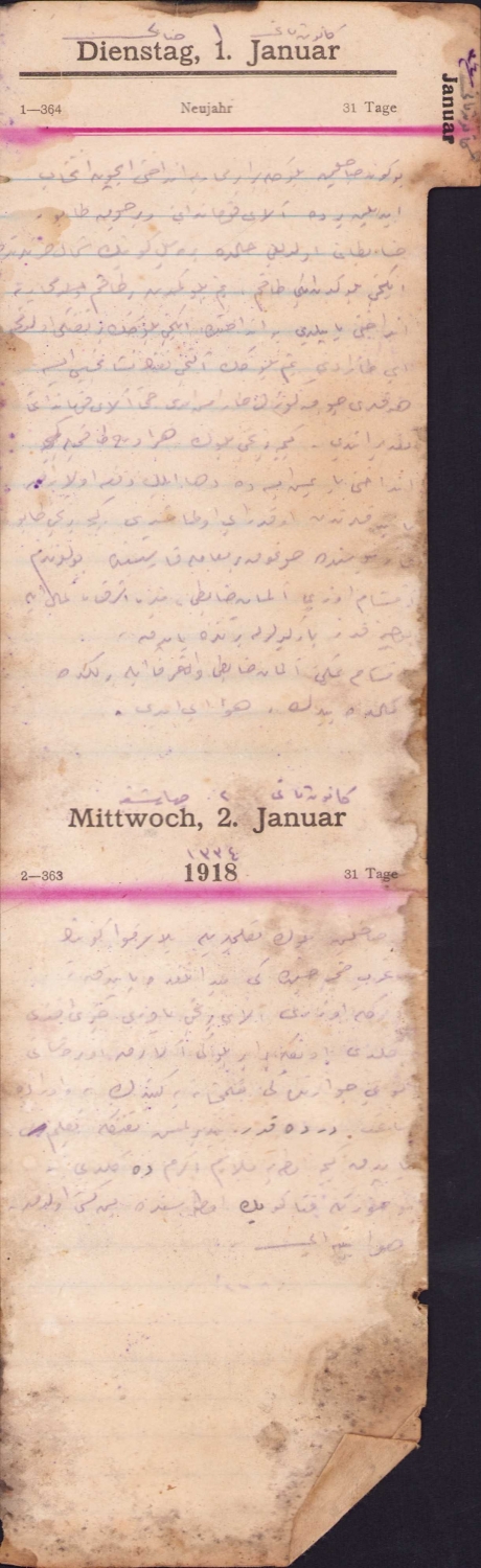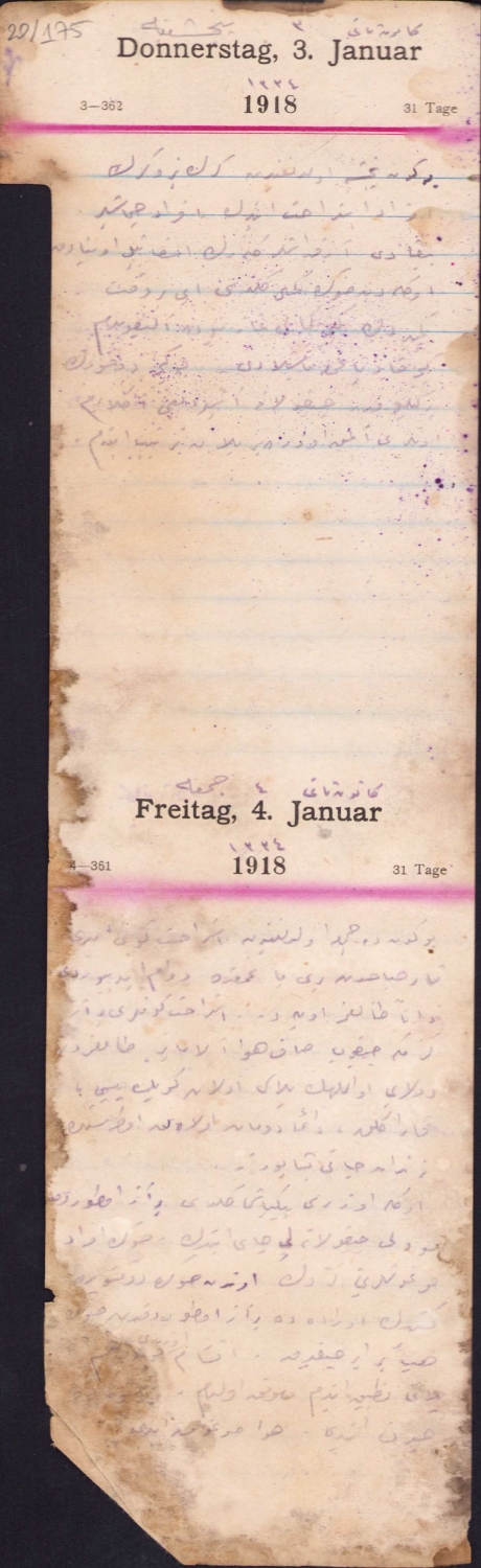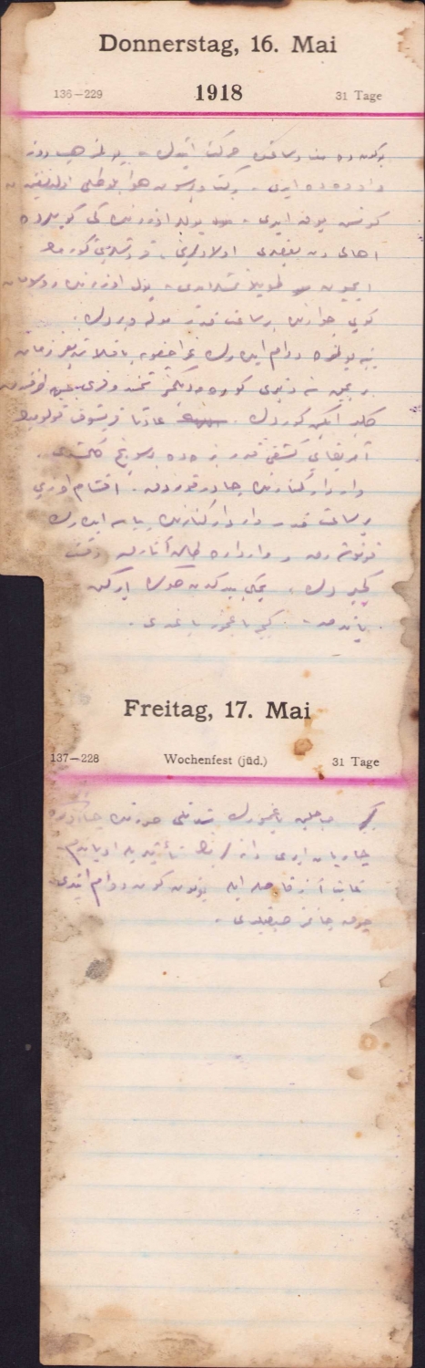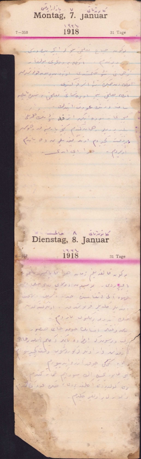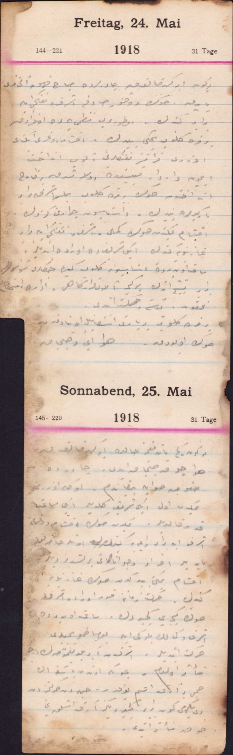 Birinci Dünya Savaşı'na katılmış bir askerin 1918 yılının muhtelif aylarında cephede iken tuttuğu günlüğü, 92 takvim gününe yazılmış 25 varak, bazı sayfalar haliyle, 9x33,5 cm.