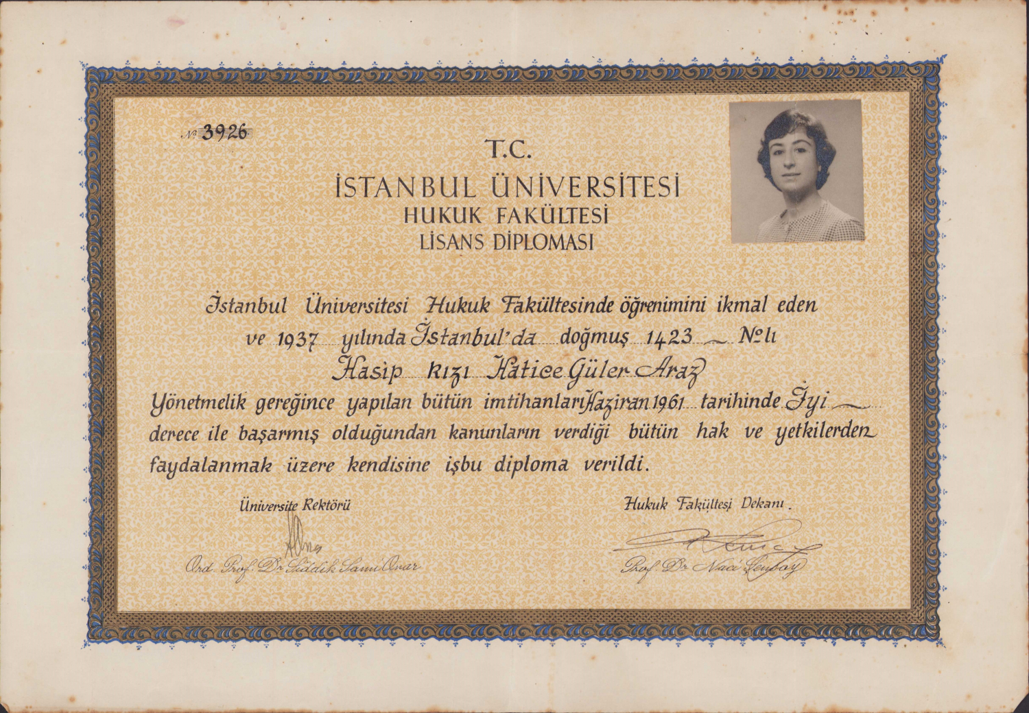İstanbul Üniversitesi Hukuk Fakültesi Lisans Diploması, 1961 tarihli, pullu, mühürlü
