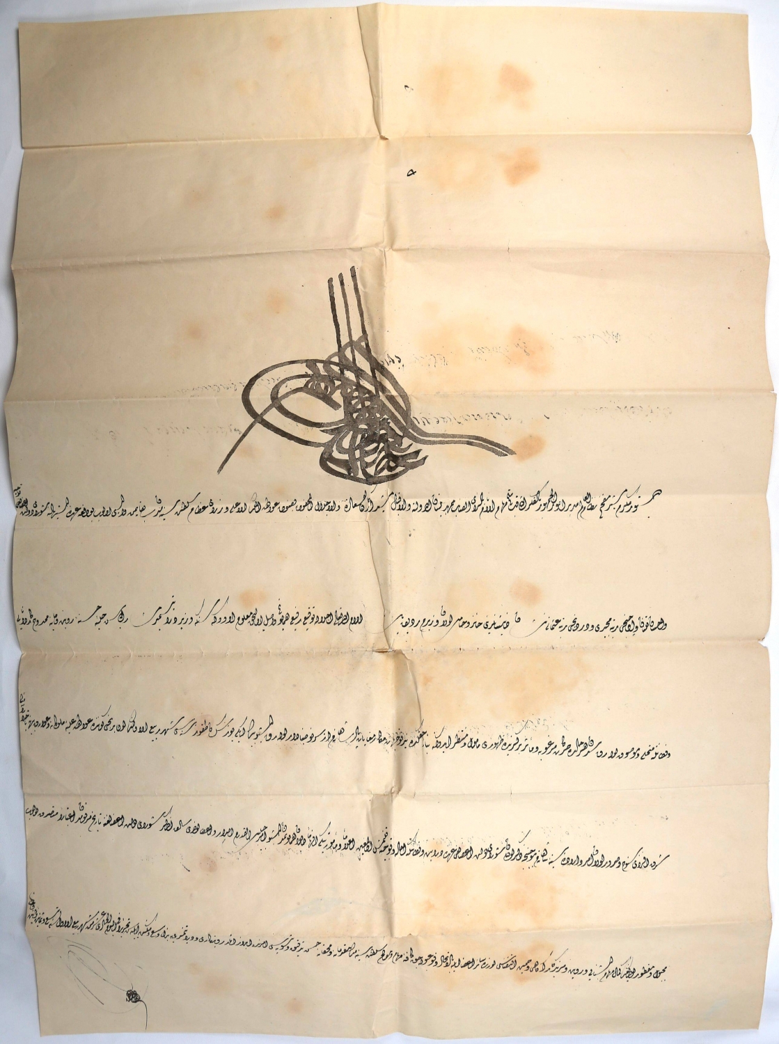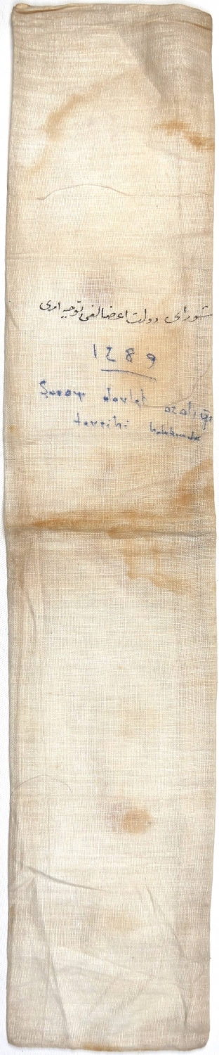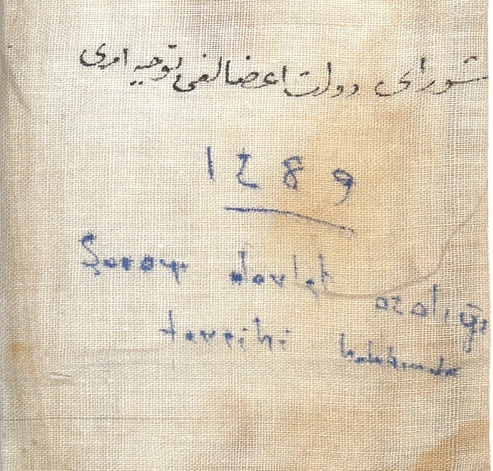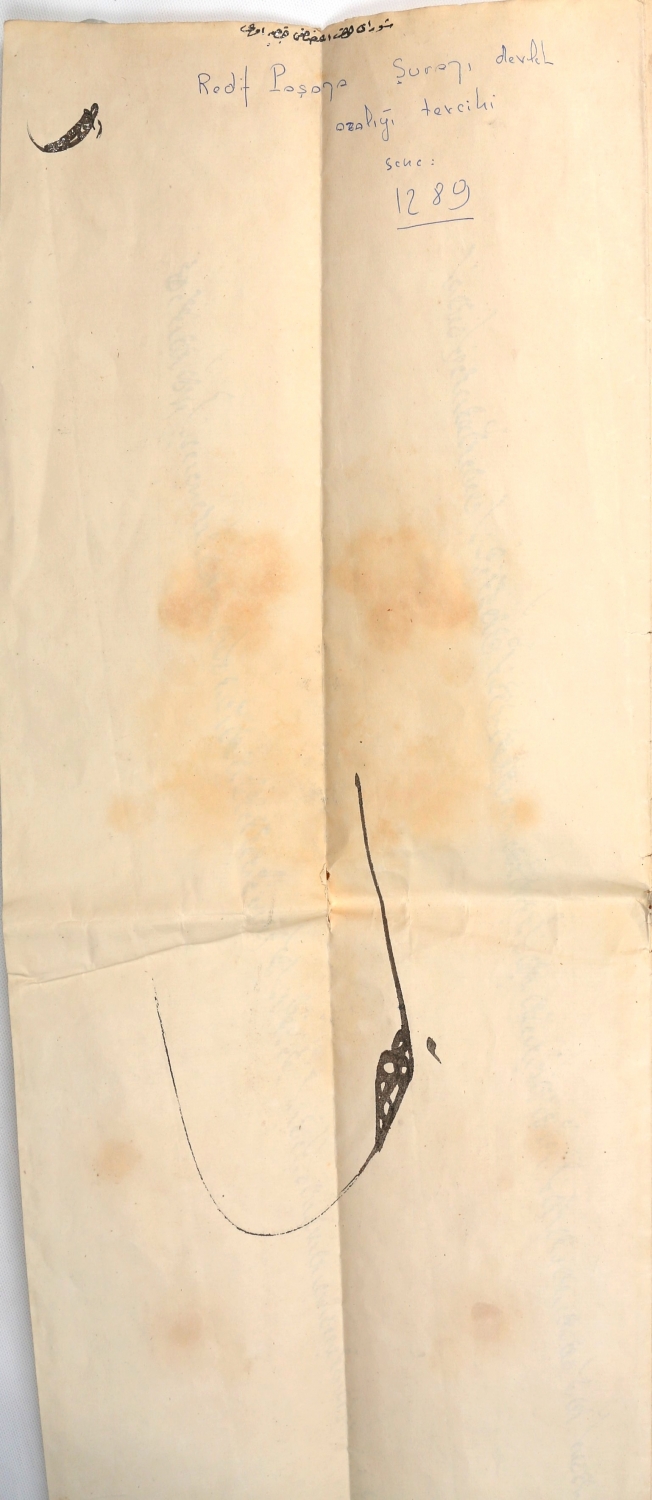 Redif Paşa'nın Şura-yı Devlet Azalığı Tevcih Emri, 1289 tarihli, Sultan Abdülaziz el çekme tuğralı, orijinal bez kılıfında, 57x80.