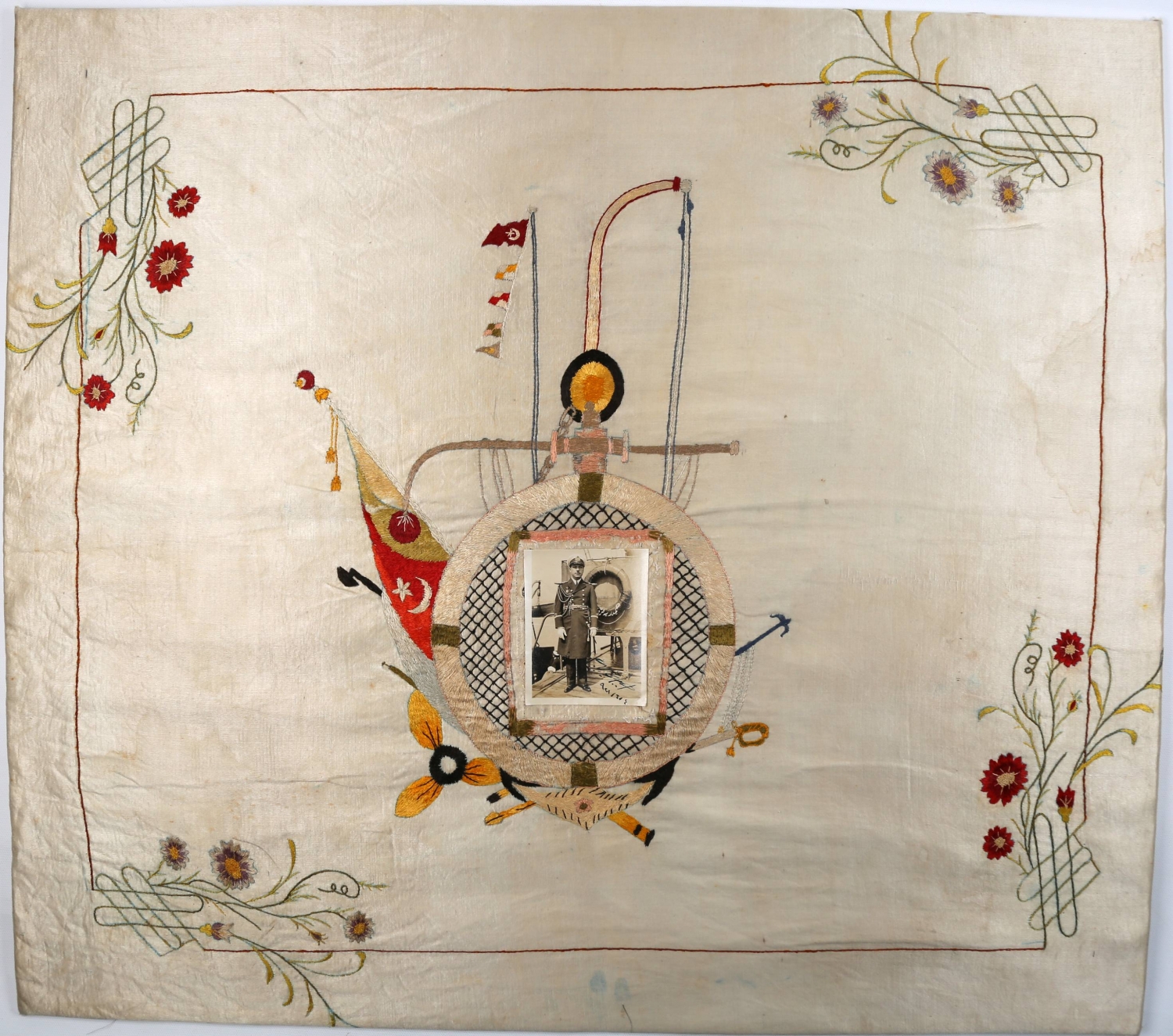 Osmanlı Hamidiye Kruvazörü hatıra ipek mendil, ortasında Osmanlıca "Hamidiye Kruvazörü" yazılı fotoğrafı bulunan, ay-yıldız bayrak, çiçek ve denizcilik motifleri işlenmiş ipek mendil, 55x50 cm.