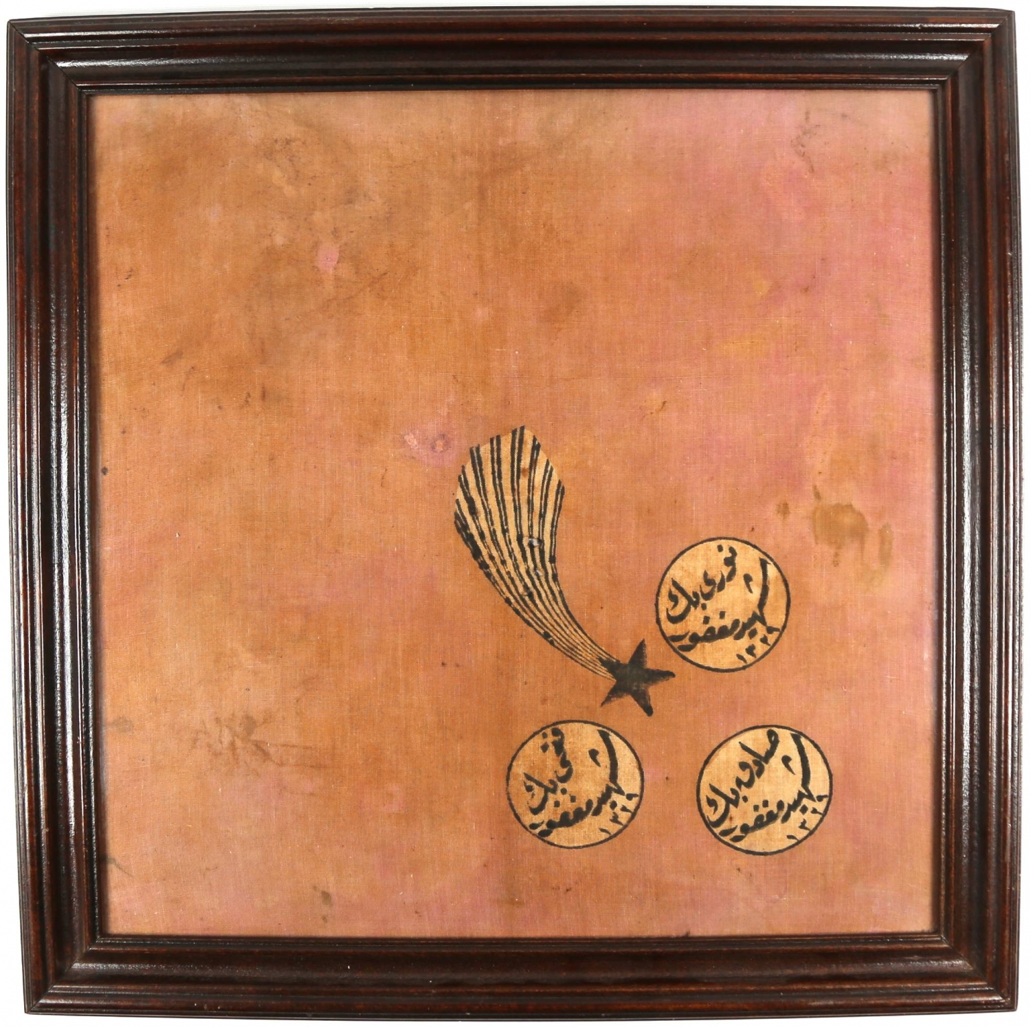 Türk Havacılığının ilk şehitleri olan Fethi Bey, Sadık Bey ve Nuri Bey'in isimleri ile 1329 tarihi ve düşen bir yıldız motifi işlenmiş mendil, Osmanlıca, 38x38 cm.