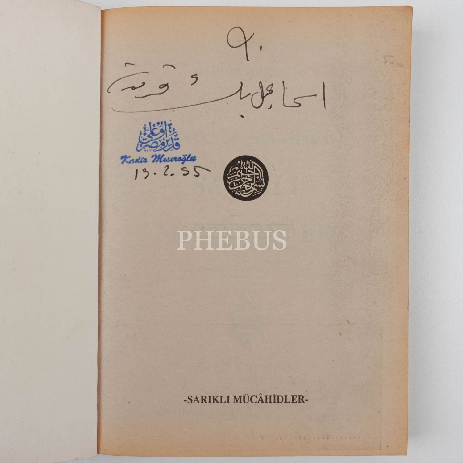 Kitabın künye sayfasında, Kadir Mısıroğlu tarafından eski harflerle kaleme alınan "İsmail Bey kardeşime" ithafı ve Kadir Mısıroğlu´nun eski ve yeni harflerden oluşan kütüphane damgası mevcuttur.