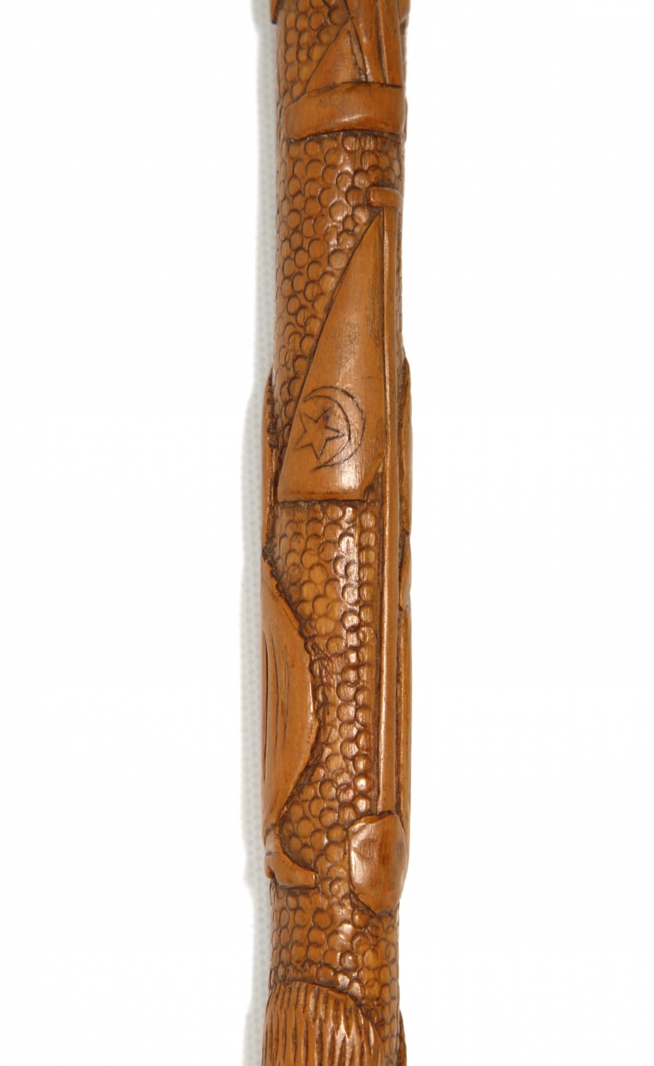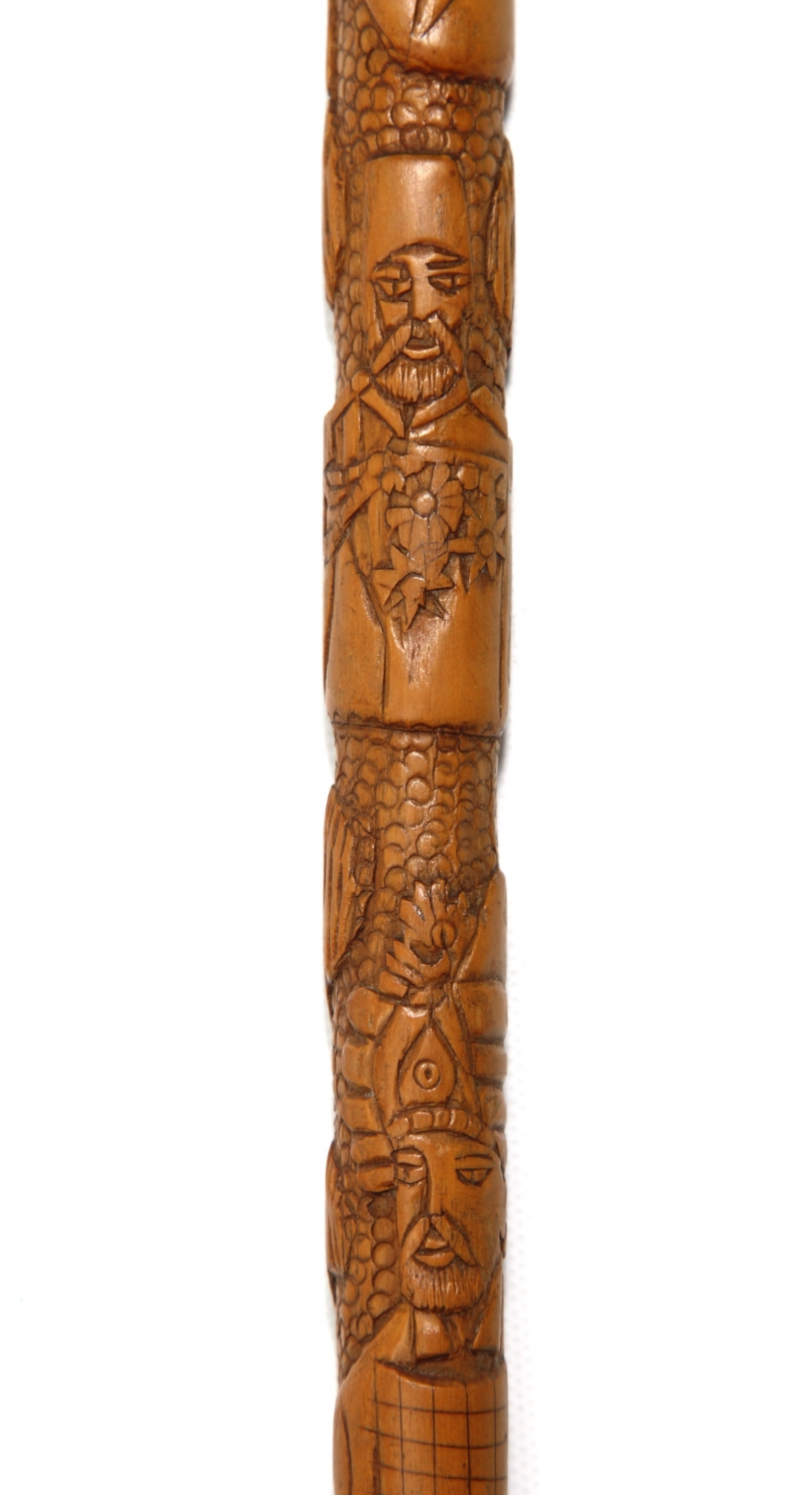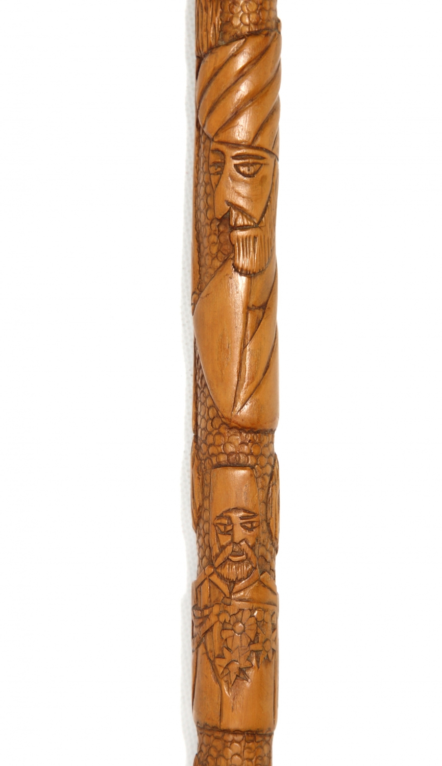 Üzerinde Atatürk, Fatih ve bazı hükümdar tasvirleri oyulmuş erken dönem ahşap baston, 93 cm.