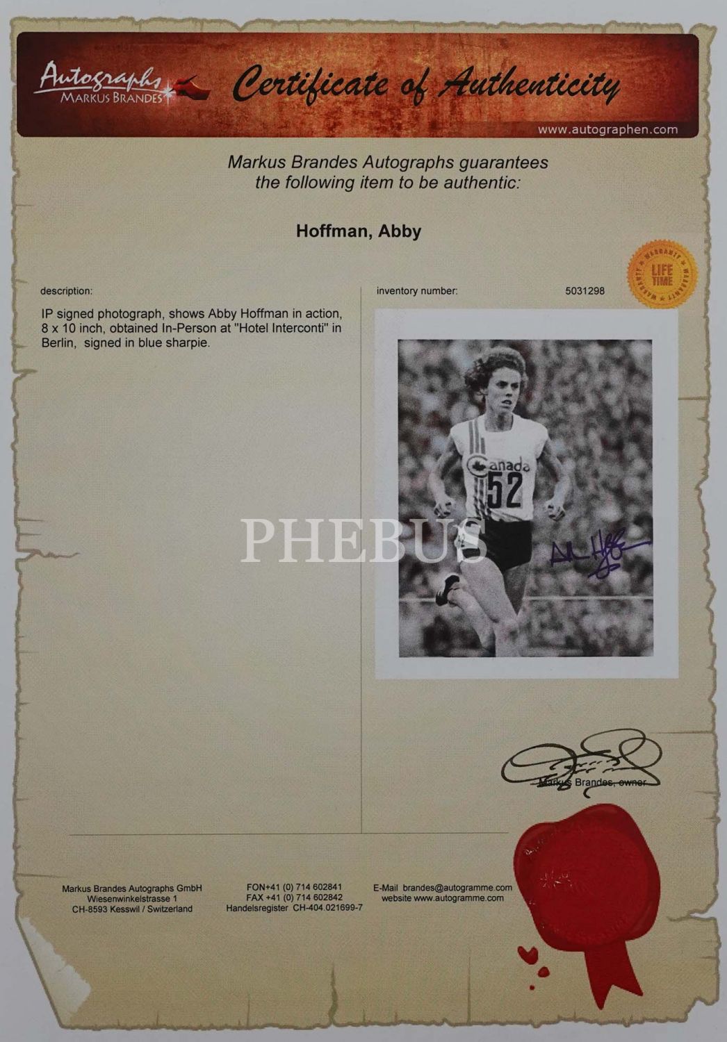 Olimpiyat atleti Abby Hoffman´ın imzalı ve sertifikalı fotoğrafı, 21x25 cm....