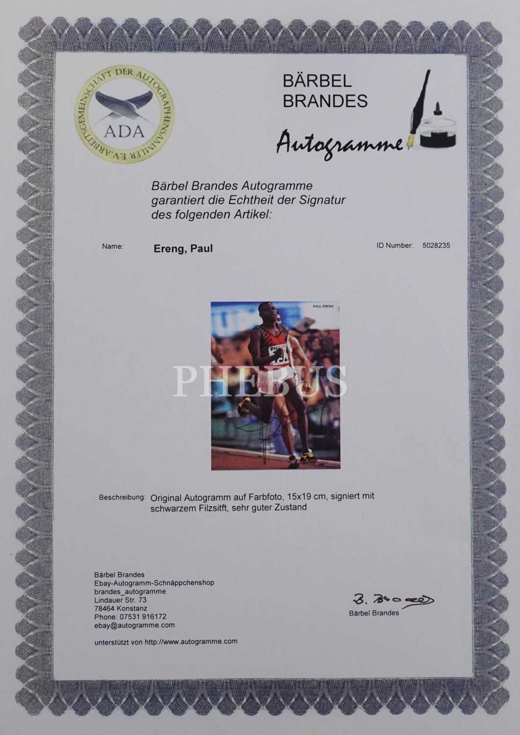 Olimpiyat atleti Paul Ereng´in imzalı ve sertifikalı fotoğrafı, 15x19 cm...