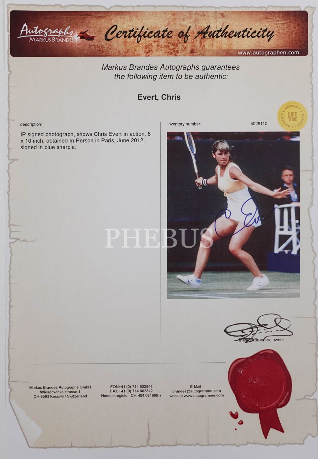 Tenisçi Chris Evert´ın imzalı ve sertifikalı fotoğrafı, 21x25 cm....