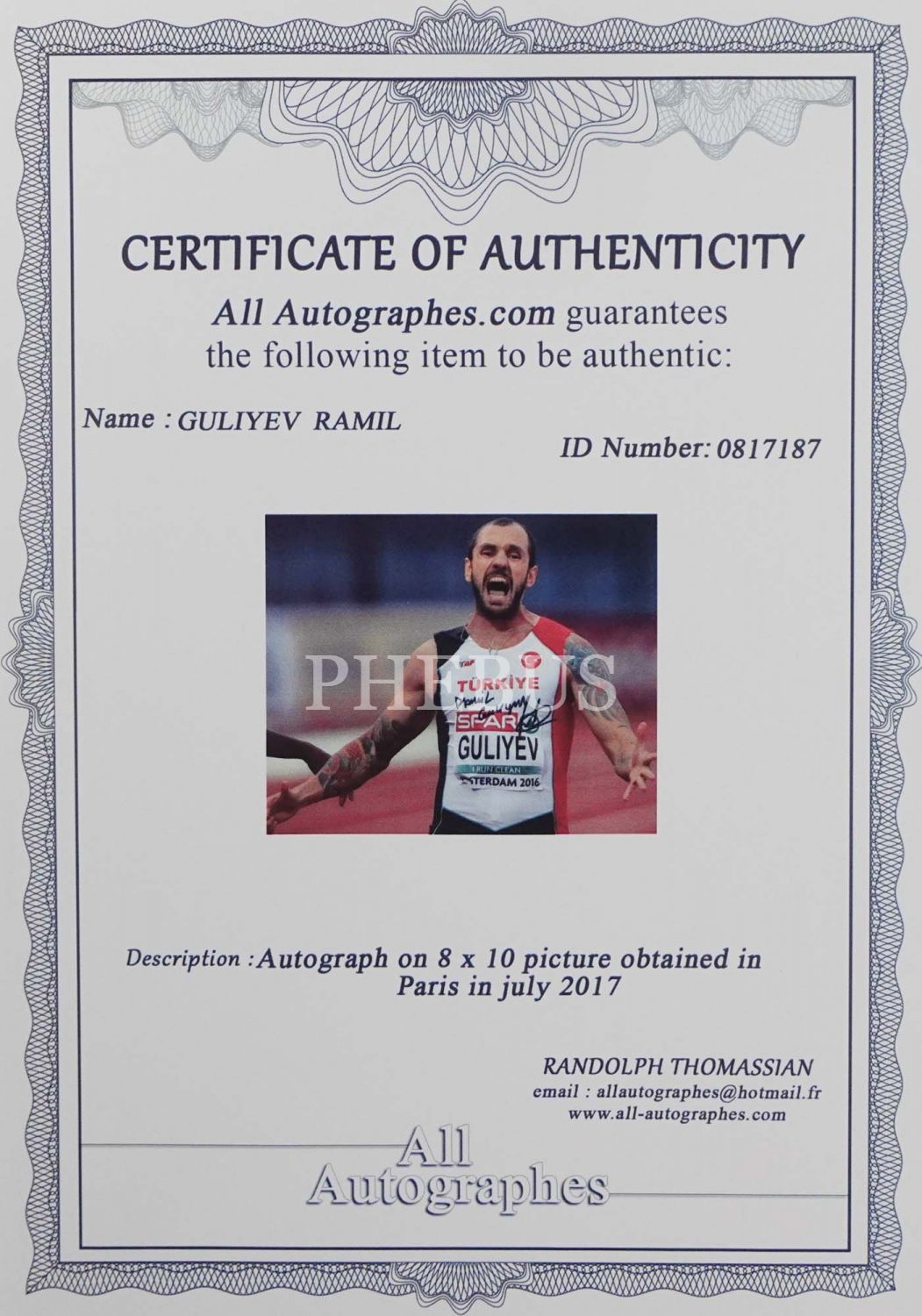 Milli Olimpiyat atletimiz Ramil Guliyev´in imzalı ve sertifikalı fotoğrafı, 21x25 cm....