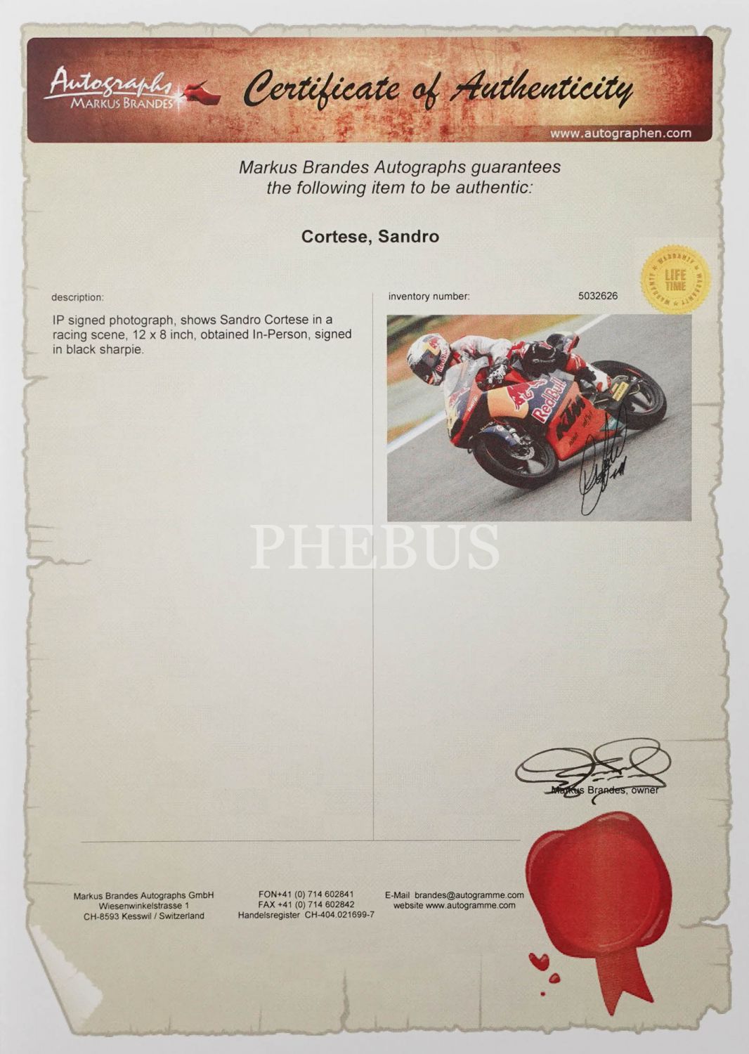 Motosiklet yarışçısı Sandro Cortese´nin imzalı ve sertifikalı fotoğrafı, 21x25 cm....