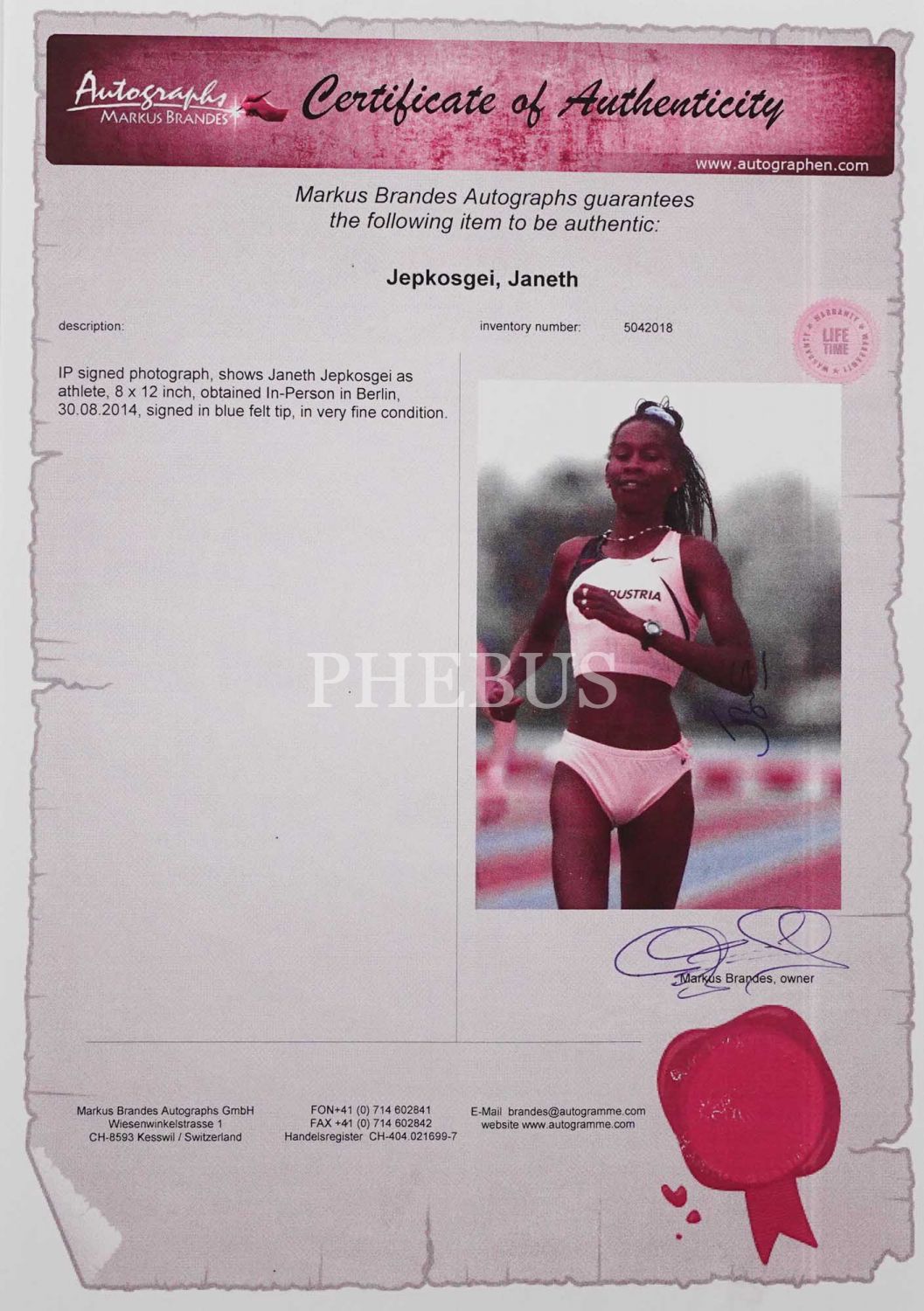 Olimpiyat atleti Janeth Jepkosgei´nin imzalı ve sertifikalı fotoğrafı, 21x25 cm....