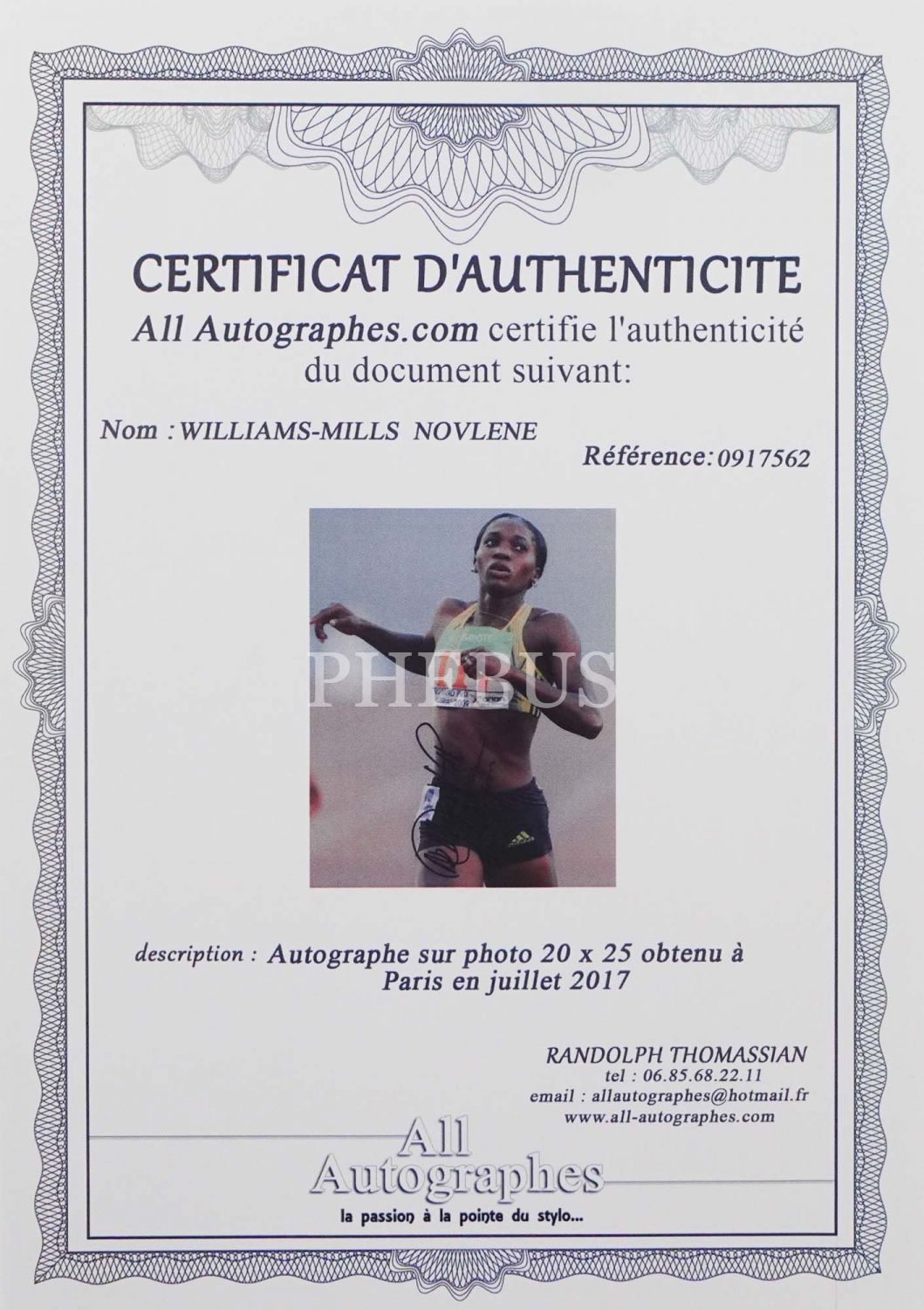 Olimpiyat atleti Novlene Williams-Mills´in imzalı ve sertifikalı fotoğrafı, 21x25 cm....