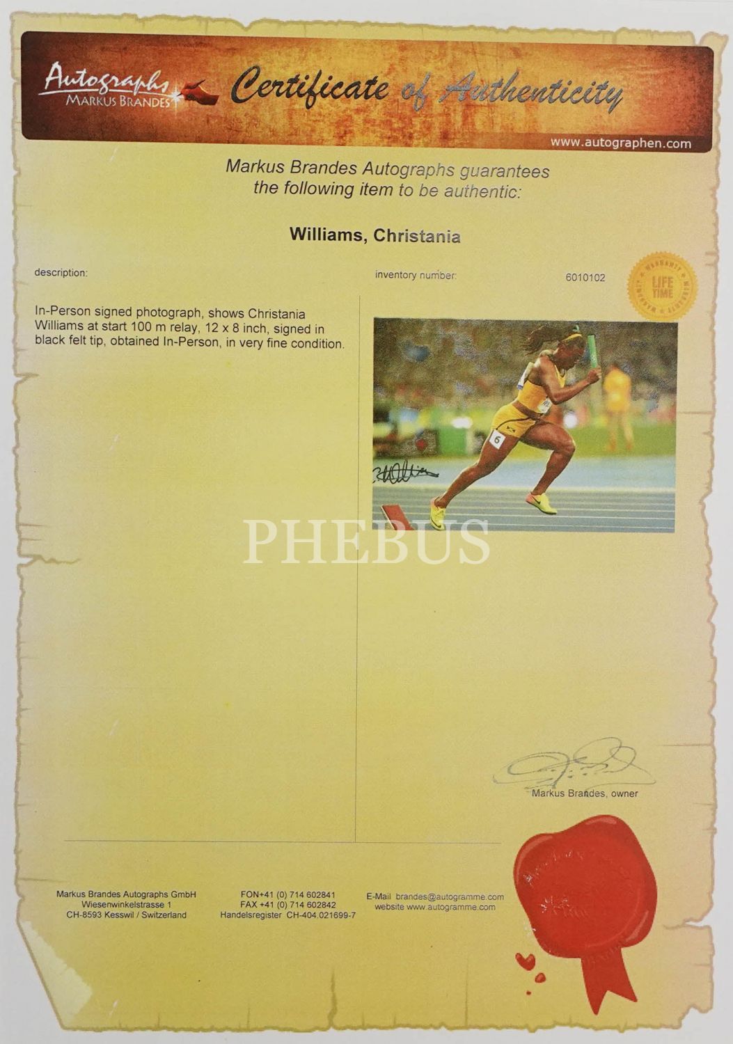 Olimpiyat atleti Christania Williams´ın imzalı ve sertifikalı fotoğrafı, 21x25 cm....
