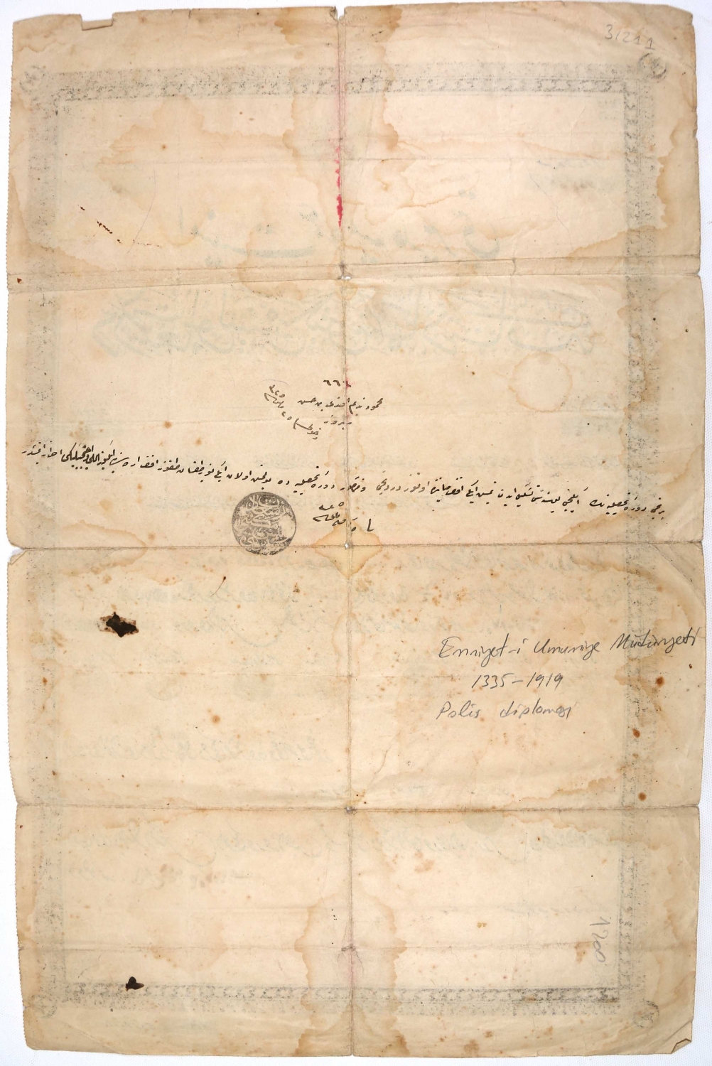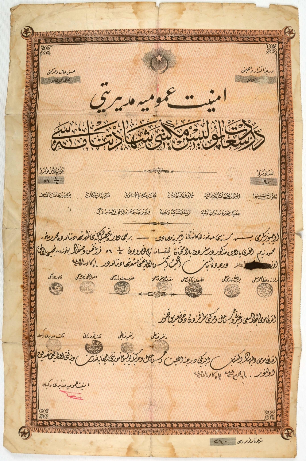 Emniyet-i Umumiye Müdiriyeti Dersaadet Polis Mektebi Diploması, Mahmud Nedim Efendi'ye ait, Rumi 1325 tarihli, imzalı ve damgalı, 29x45 cm.
