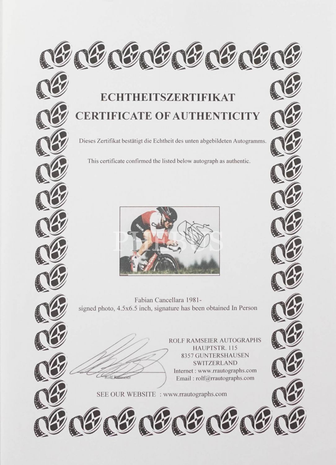 Bisiklet yarışçısı CAncellara Fabian´ın imzalı ve sertifikalı fotoğrafı, 16x12 cm....