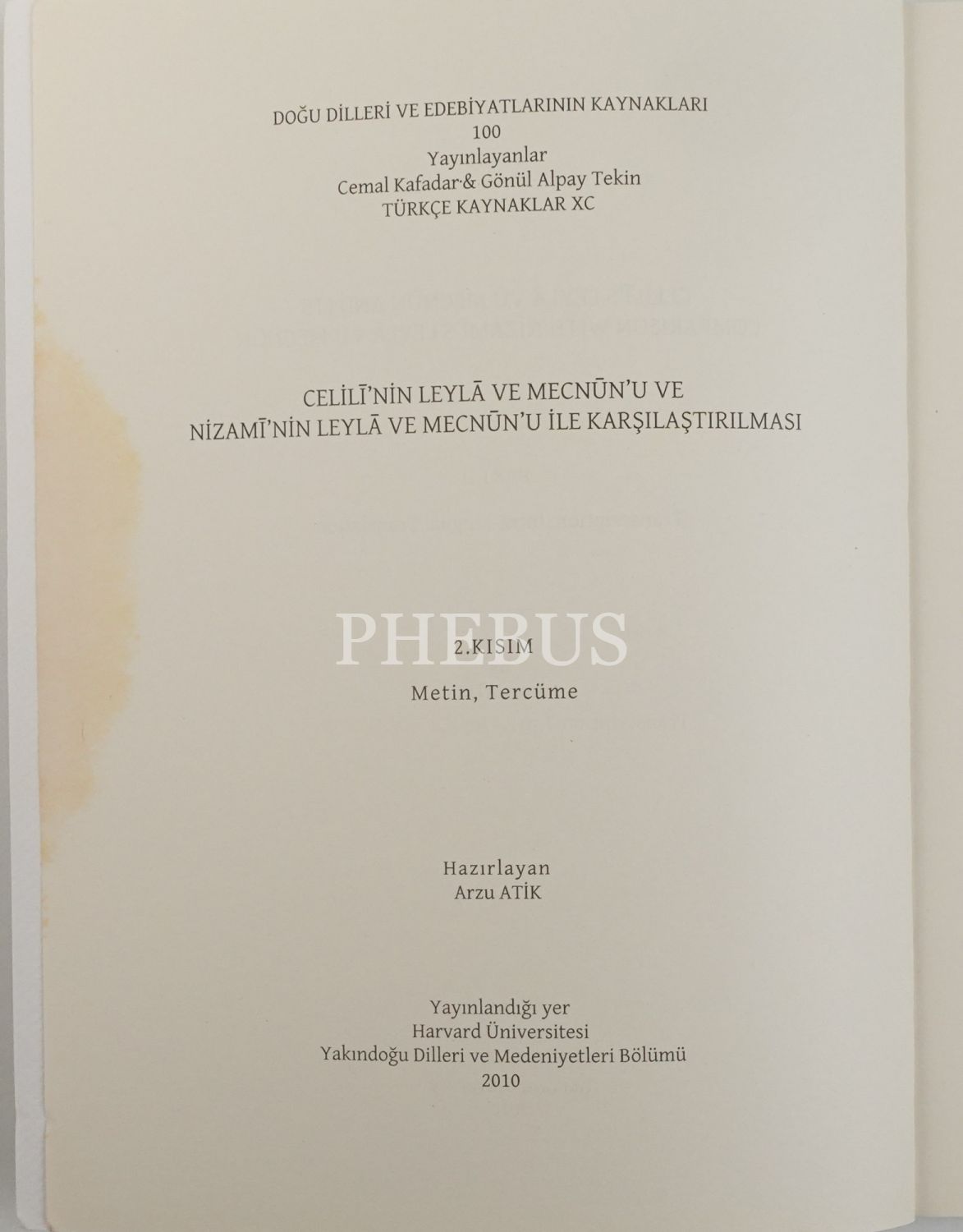 CELİLδNİN LEYL VE MECNÛN´U VE NİZAMδNİN LEYL VE MECNÛN´U İLE KARŞILAŞTIRILMASI (2 cilt), (hazırlayan: Arzu Atik / yayınlayanlar: Cemal Kafadar - Gönül Alpay Tekin), 2010, Harvard Üniversitesi Yakındoğu Dilleri ve Medeniyetleri Bölümü, 257+247 sayfa, 22x28 cm...