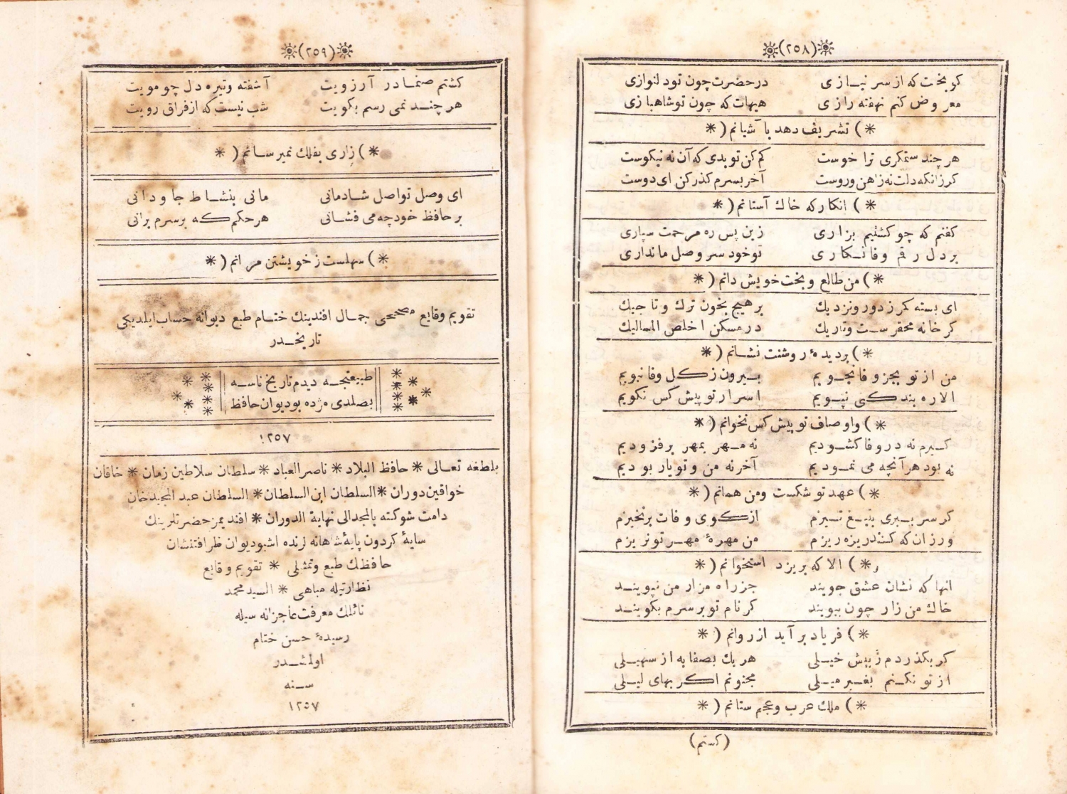 Taş Baskı Hafız-ı Şirazi Divanı, 259 sayfa, 1257 tarihli, Farsça, 15,5x22,5 cm.