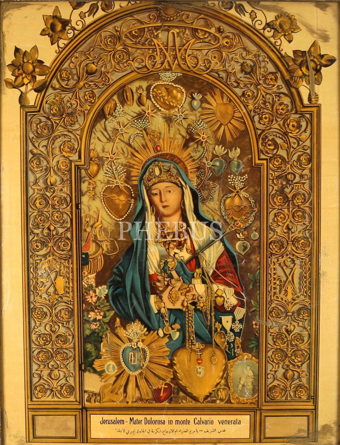 Jerusalem-Kudüs-ü'ş-Şerif ve 'Mater Dolorosa in monte Calvario venerata' yazılı taş baskı dini afiş, çerçeveli, 31,5x42 cm.