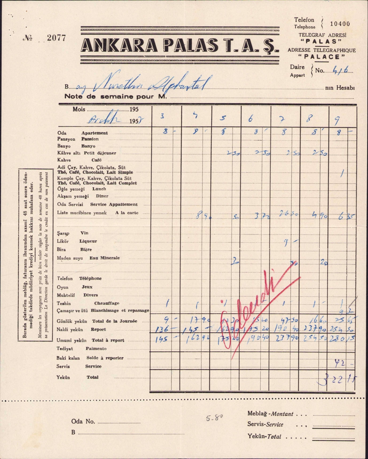 Fransızca - Türkçe Ankara Palas antetli fatura, 20x28 cm
