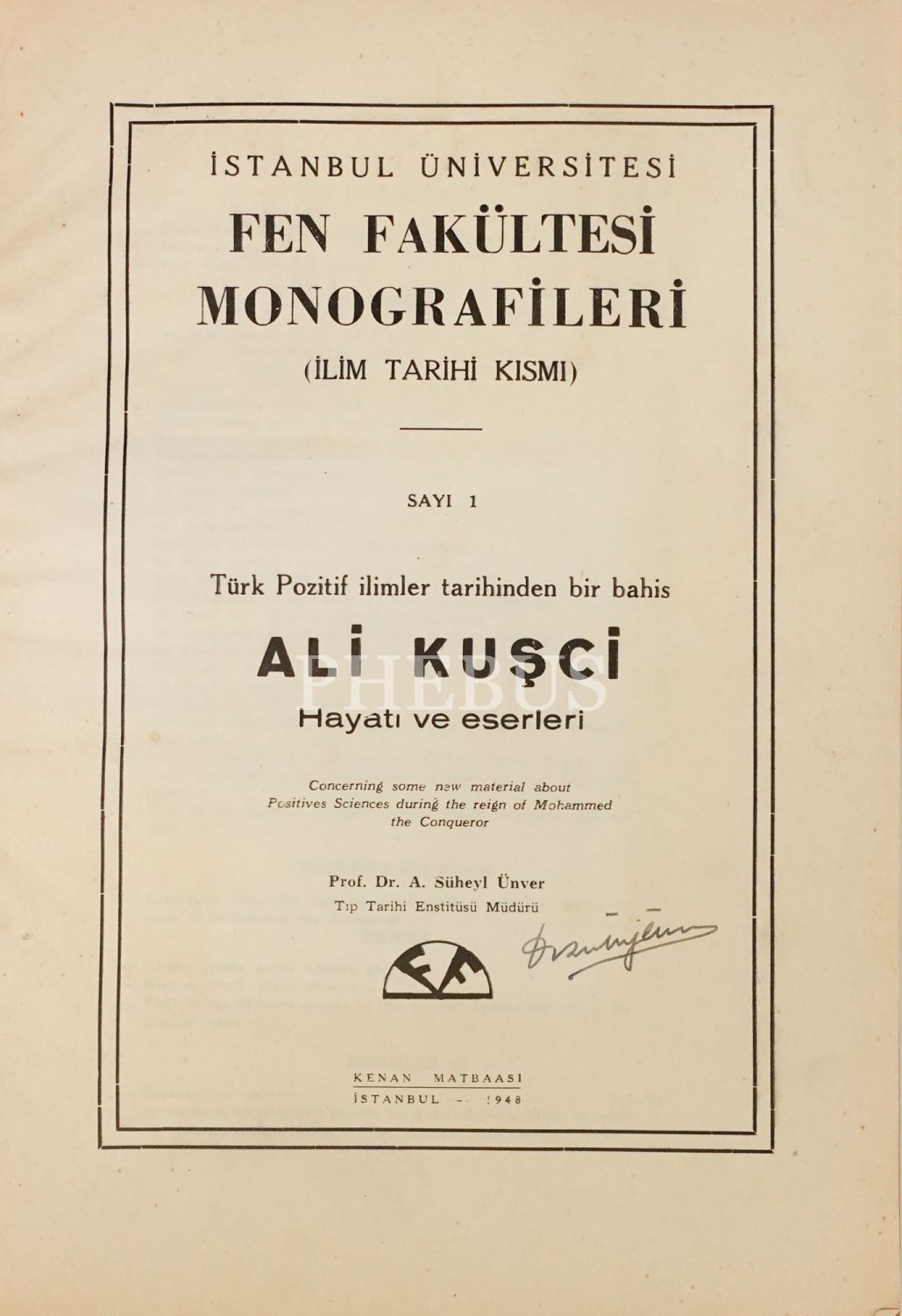 Türk Pozitif İlimler tarihinden bir bahis: ALİ KUŞÇU HAYATI VE ESERLERİ, Süheyl Ünver, 1948, İstanbul Üniversitesi Fen Fakültesi Monografileri, 90 sayfa, 20x30 cm...