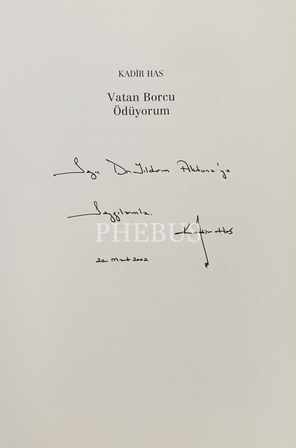 "Sayın Dr. Yıldırım Aktuna´ya saygılarımla" ithafıyla 22 Mart 2002 tarihinde imzalanmıştır.
