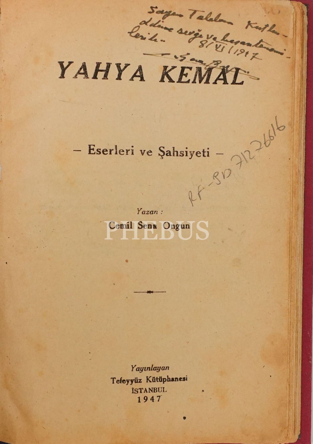 YAHYA KEMAL ESERLERİ VE ŞAHSİYETİ, Cemil Sena Ongun, 1947,Tefeyyüz Kütüphanesi, 80 sayfa, 15x21 cm...
