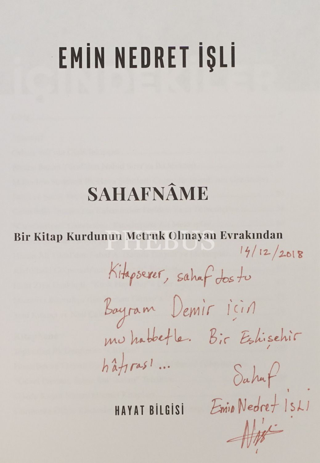"Kitapsever, sahaf dostu Bayram Demir için mıhabbetle. Bir Eskişehir hatırası..." ithafıyla 14 Aralık 2018 tarihinde imzalanmıştır.
