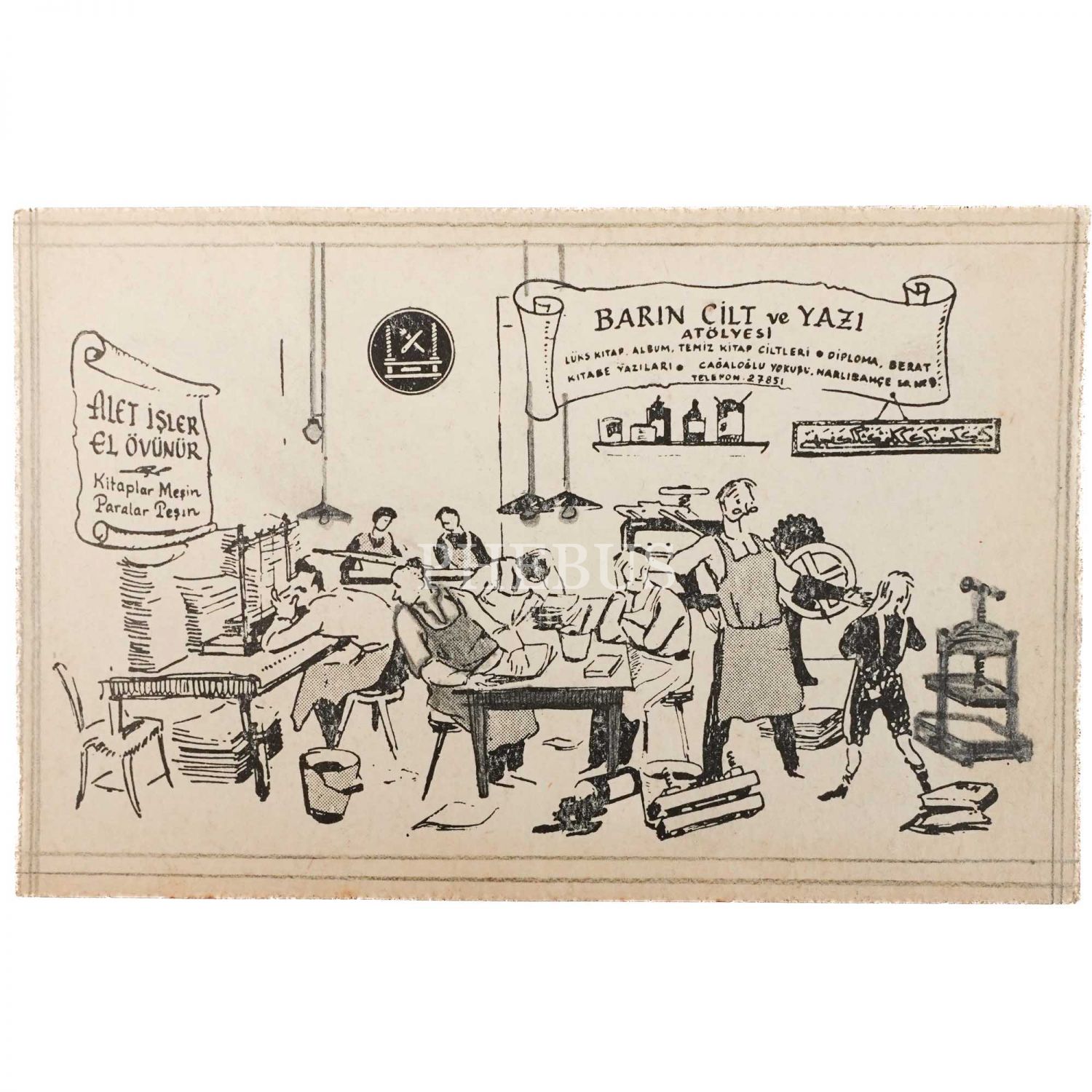 Emin Barın Cilt ve Yazı Atölyesi çizimli işyeri kartı, 13x8 cm...