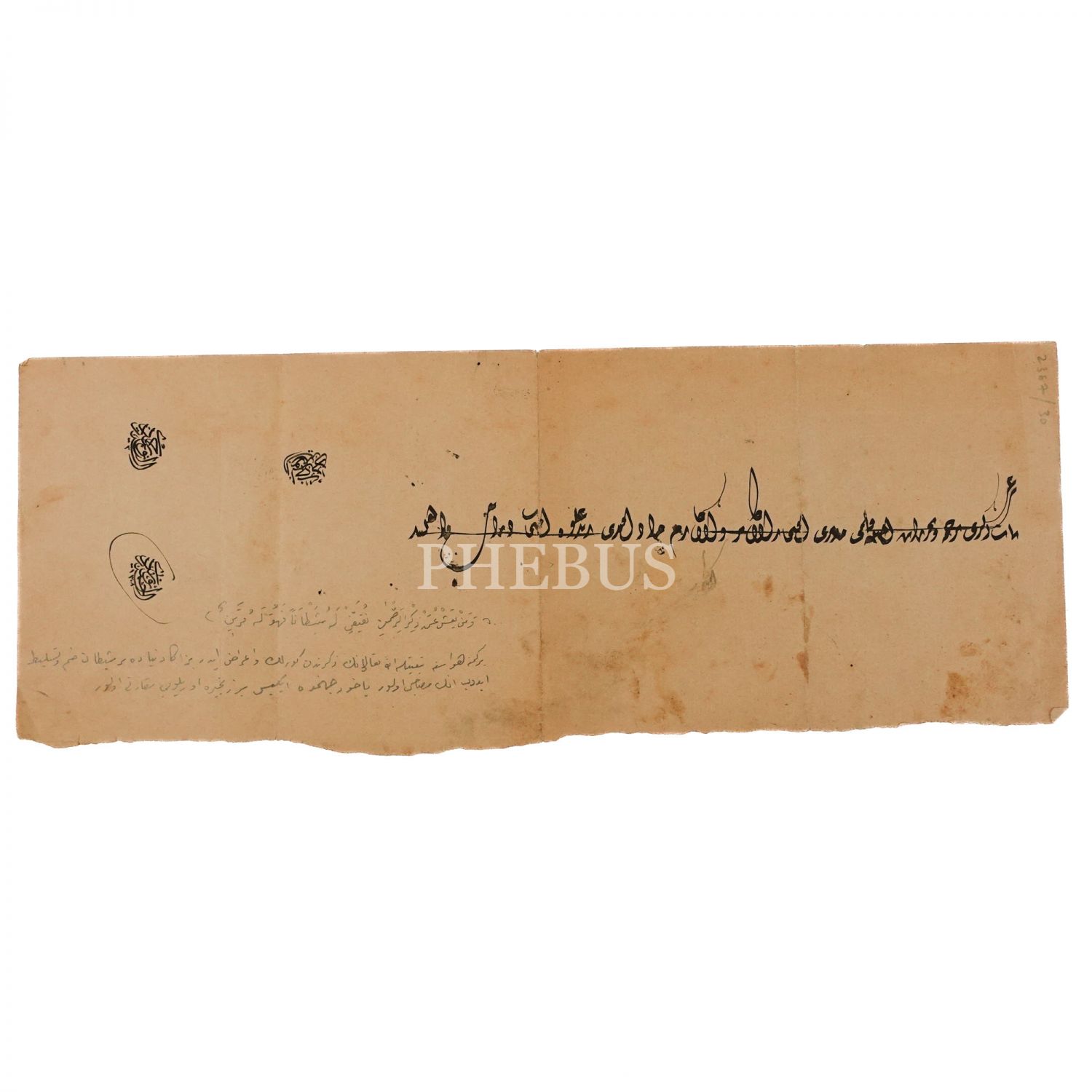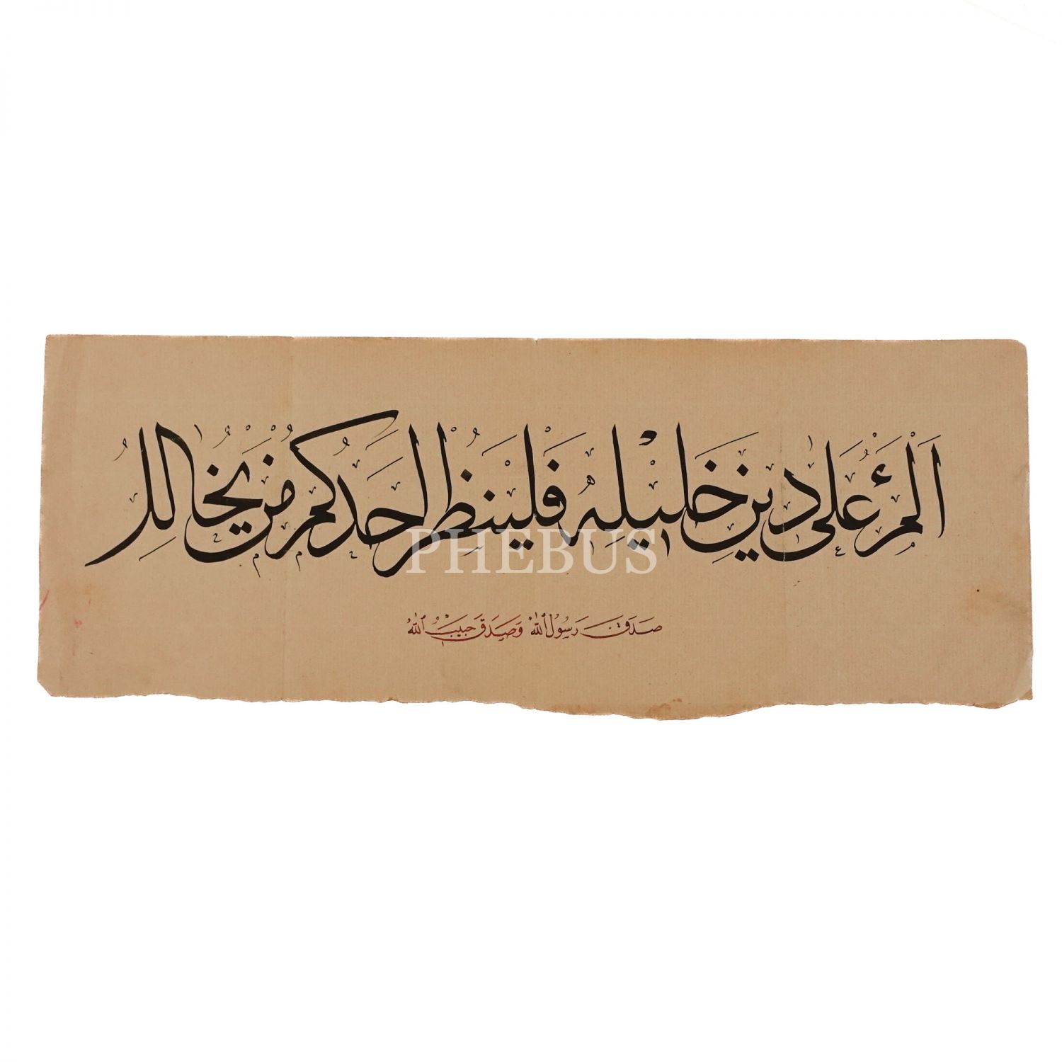 Seyyid Ahmed Nuri ketebeli sülüs hadis-i şerif, 1308 tarihli, arka yüzünde bir satır divani yazı ve üç adet ketebe bulunmaktadır, 37x14 cm...