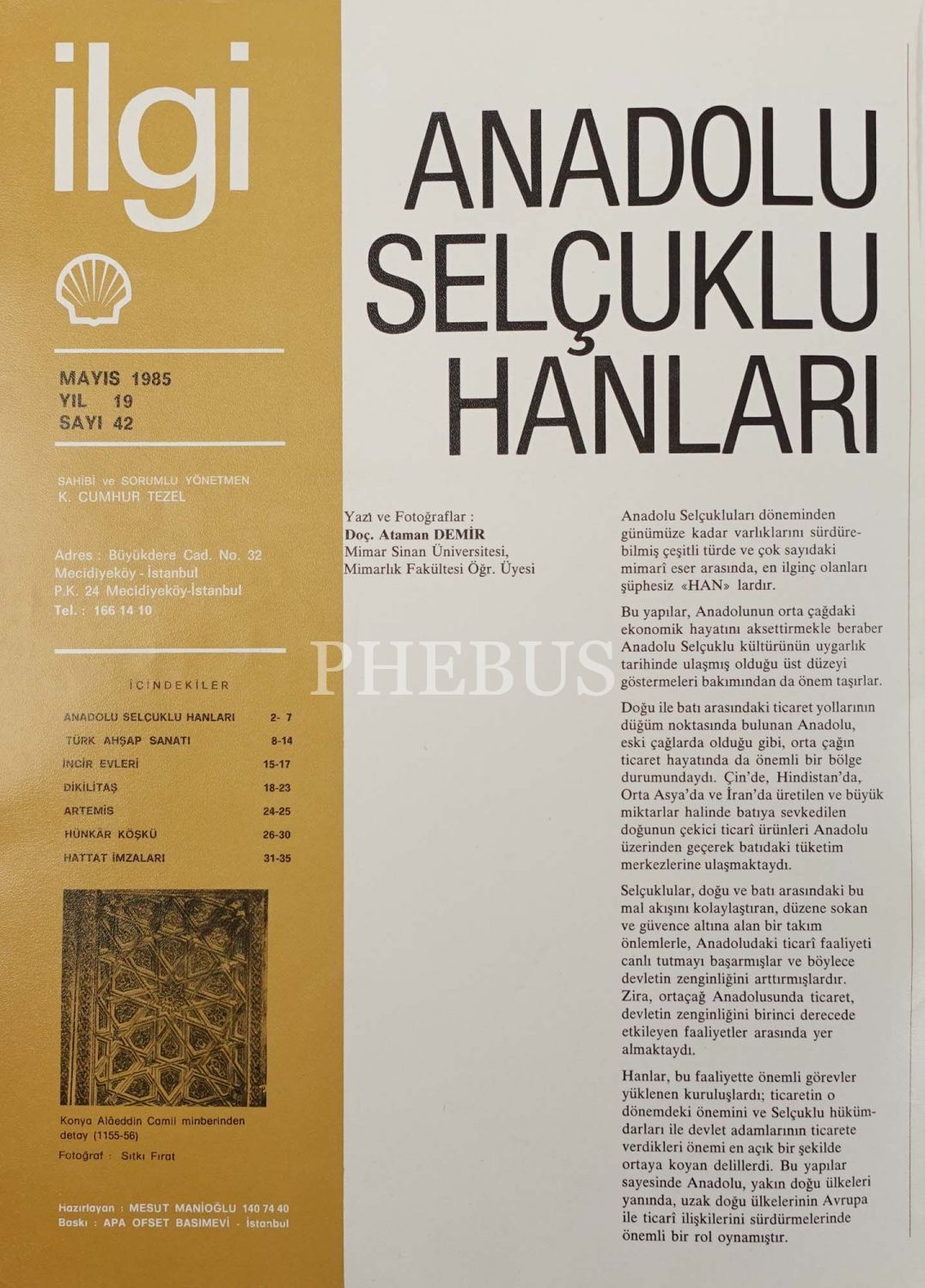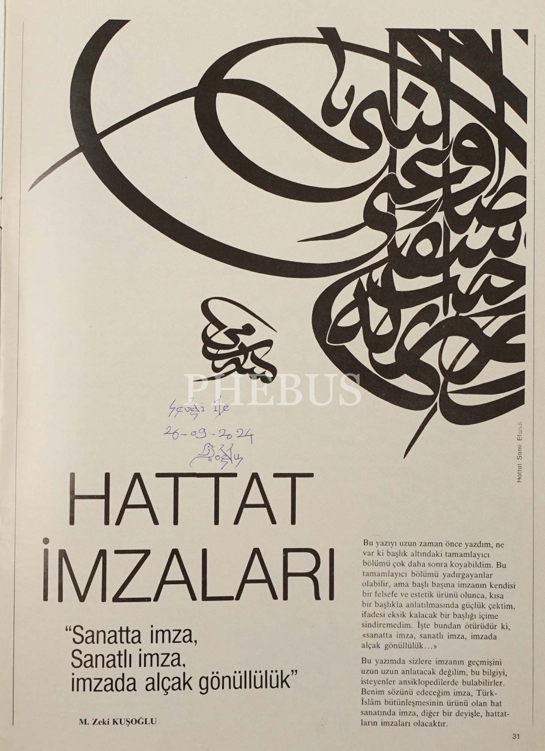 Geleneksel sanatlarımızı konu alan İLGİ DERGİSİ´nin Zeki Kuşoğlu´nun "Hattat İmzaları" yazısının bulunduğu imzalı nüshası, 33x24 cm...