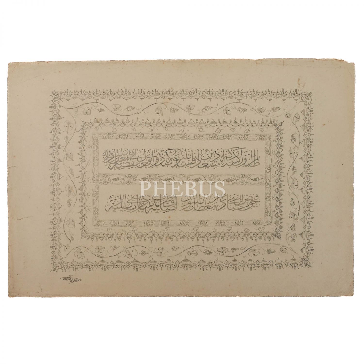 Fârûkî Attar ketebeli, tamamı kurşun kalemle yapılmış şahane tasarımlı yazı ve süslemeler, ortada sülüs yazı ile Osmanlıca bir şiir yazılıdır, 39x27 cm...