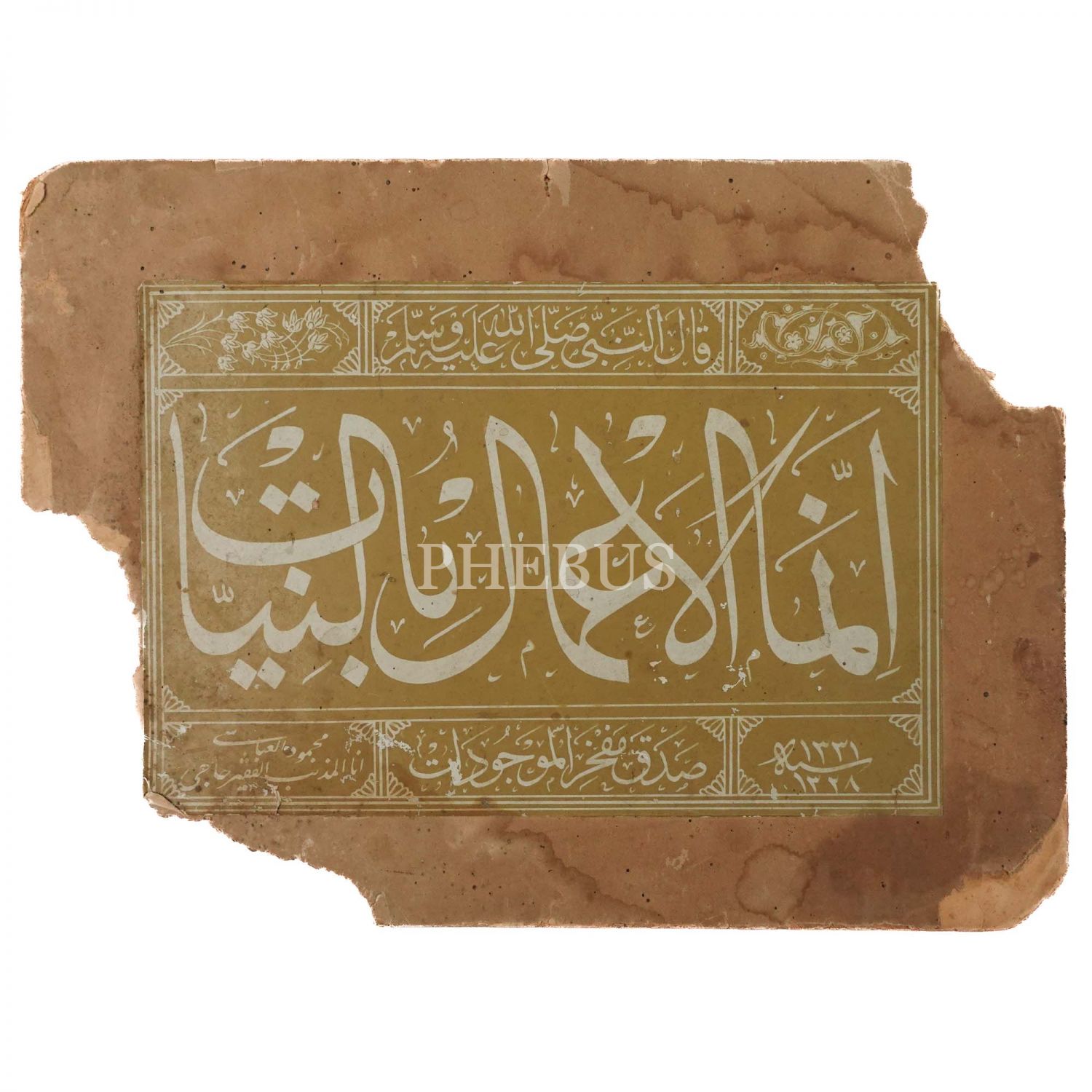 Fotoğrafta "Ameller ancak niyetlere göredir." manasındaki hadis-i şerif yazılı celi sülüs bir levha vardır.