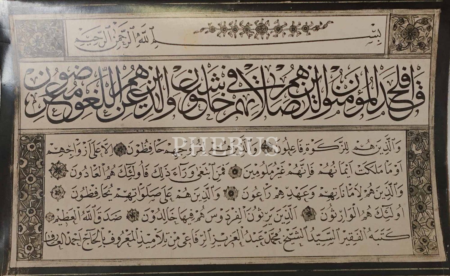 Müminun suresinin başındaki ayet-i kerimeler yazılı sülüs-nesih bir levhanın fotoğrafı.