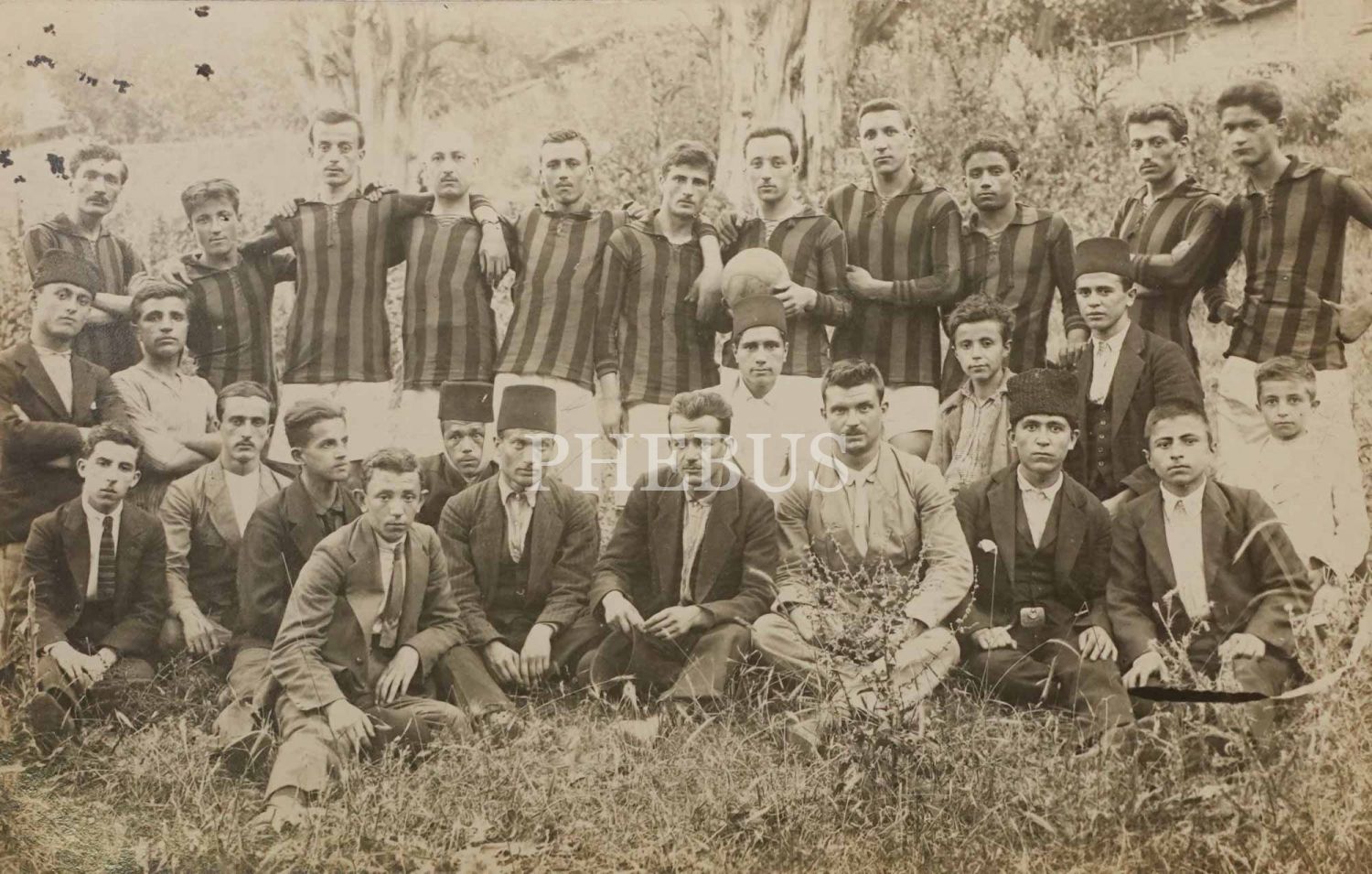 Erken Cumhuriyet döneminden bir futbol takımının maç sonrası toplu hatıra fotoğrafı çekilen oyuncuları, 14x9 cm...