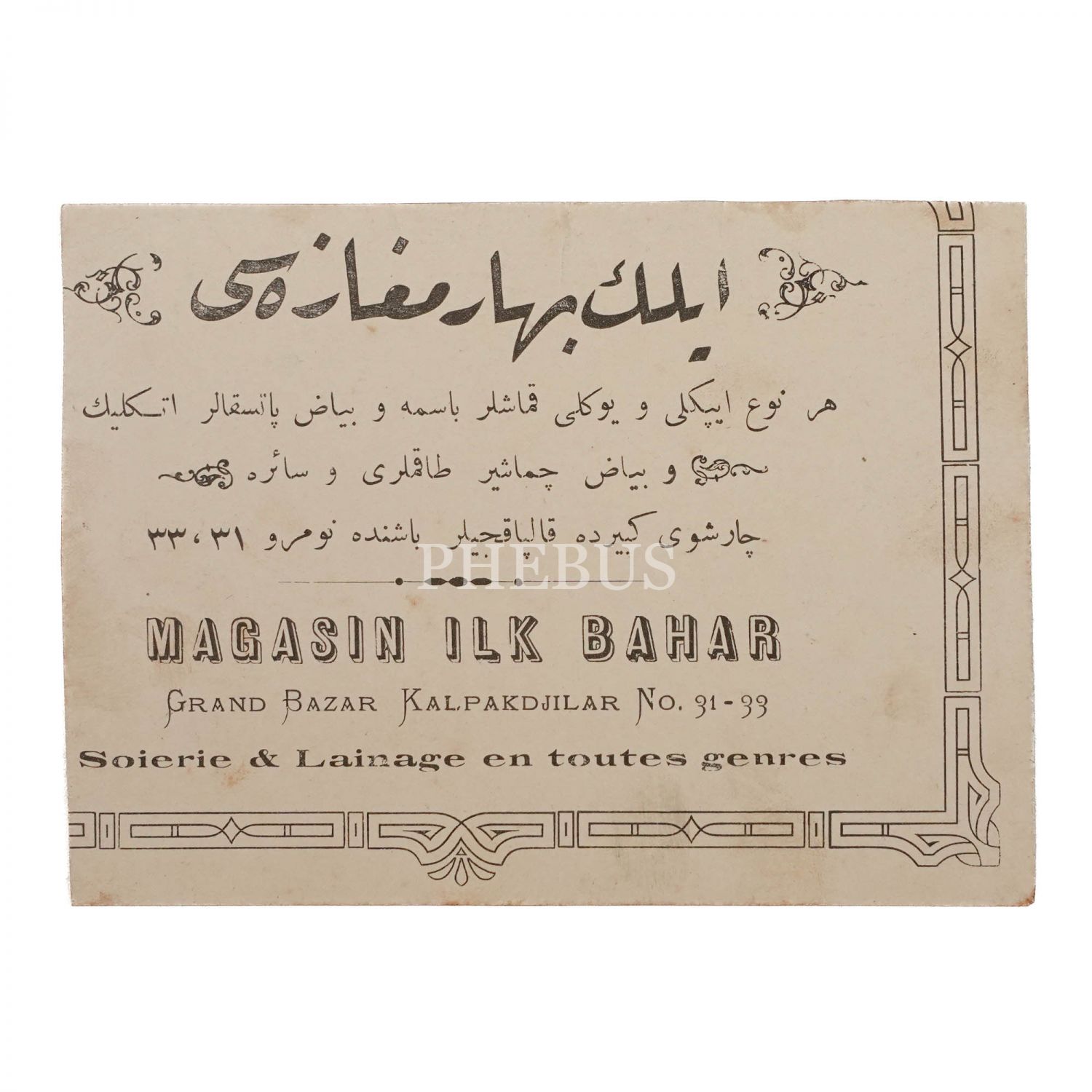 "Her nevi ipekli ve yünlü kumaşlar basma ve beyaz patiskalar eteklik ve beyaz çamaşır takımları vesaire" İlk Bahar Mağazası´nın iş yeri kartı, 12x9 cm...