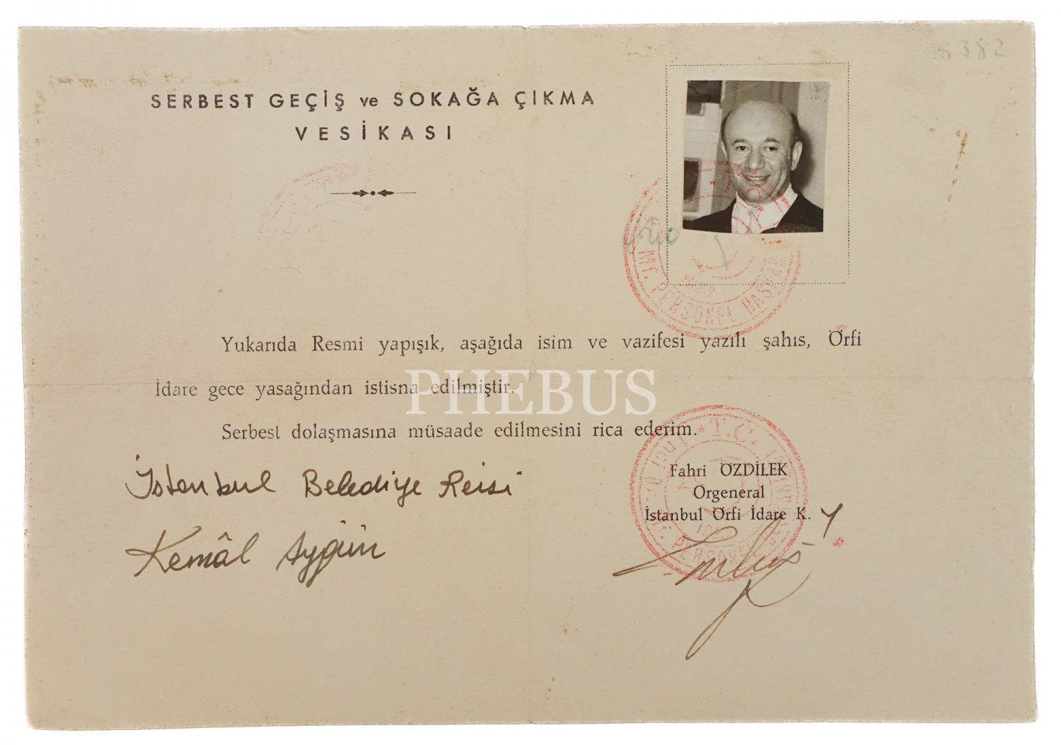 İstanbul Belediye Reisi Kemâl Aygün adına Örfi İdare Kumandanlığı´nca düzenlenmiş "Serbest Geçiş ve Sokağa Çıkma Vesikası", İstanbul Örfi İdare Komutanı Orgeneral Fahri Özdilek´ten ıslak imzalı, 21x15 cm...
