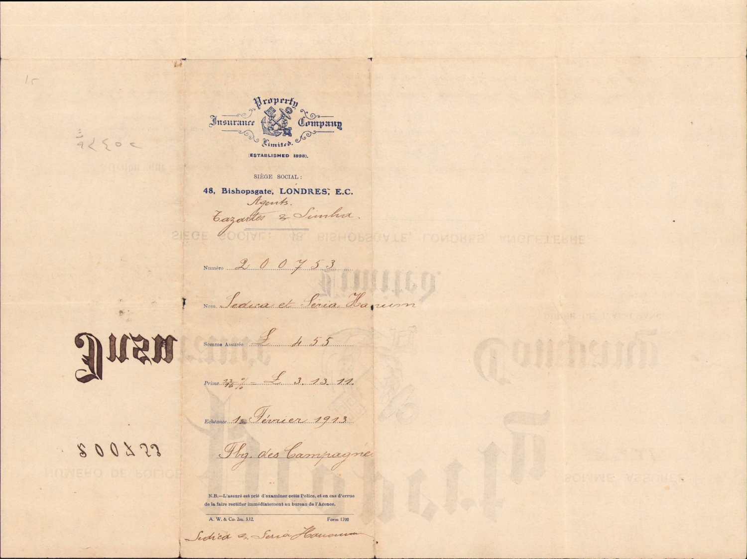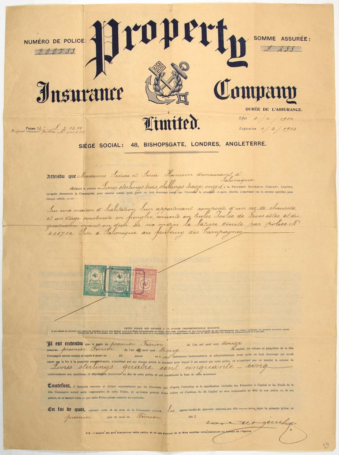 Osmanlı dönemi Selanik sigorta poliçesi, Osmanlı pullu damgalı, 1913 tarihli, 38x50 cm