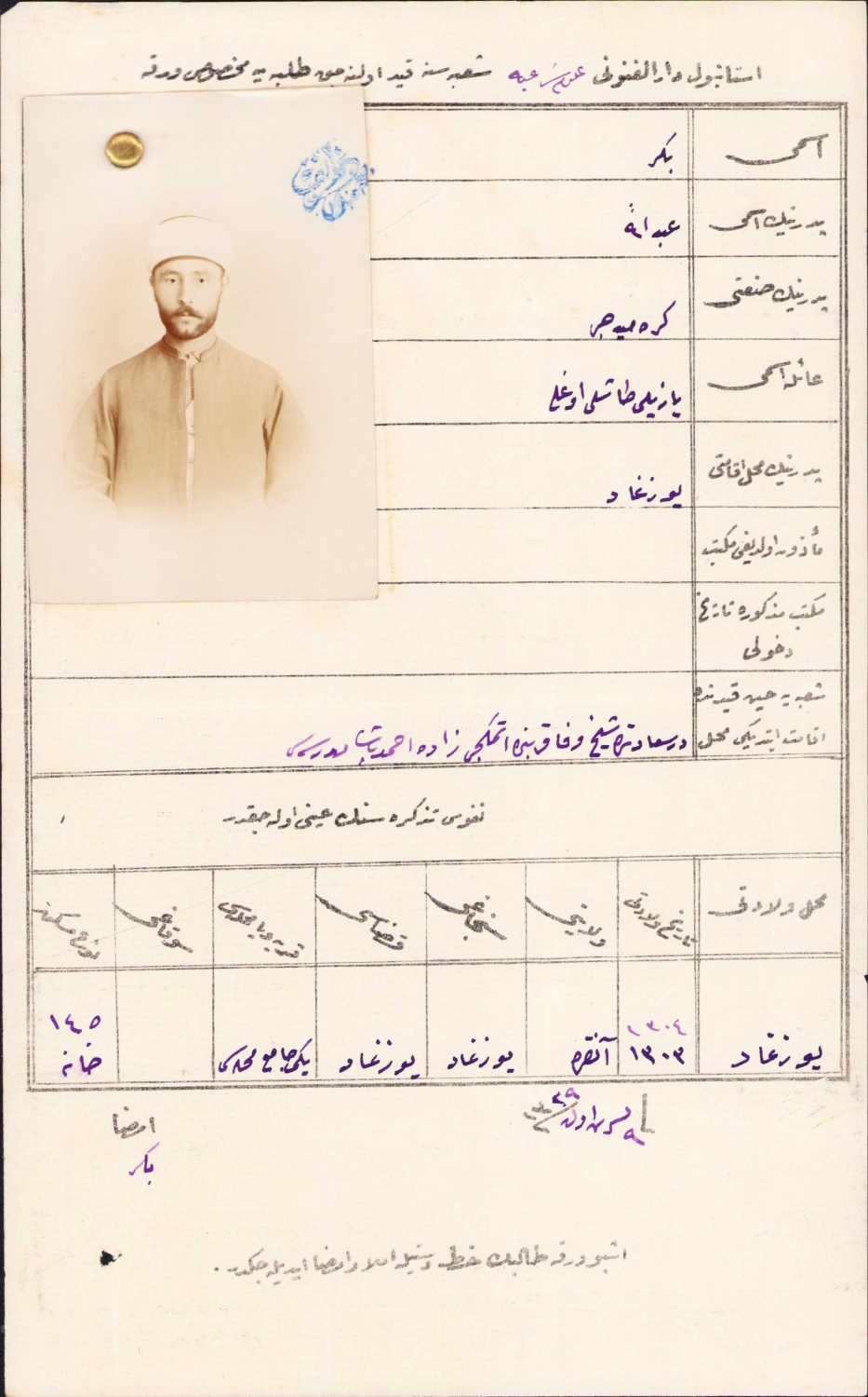 Osmanlıca İstanbul Darülfünun Ulum-ı Aliyye-i Diniyyeye kayıt olunacak Bekir isimli talebeye mahsus varaka, 1329, 16x26 cm