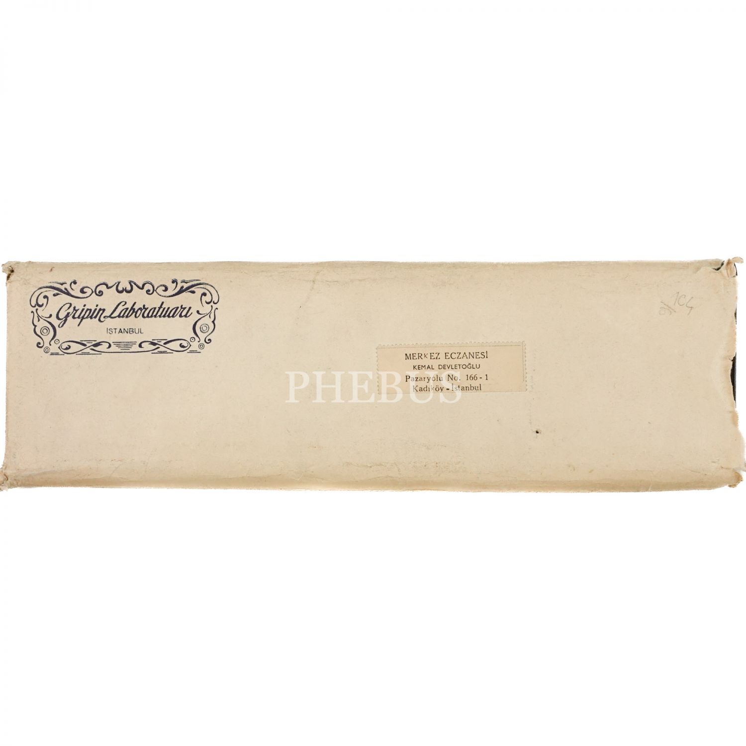 "Gripin Laboratuarı (İstanbul)" antetli zarfla Kadıköy Merkez Eczanesi sahibi Kemal Devletoğlu´na gönderilmiş, Gripin - Puro - Fay - Opon reklamlarıyla bezeli 1965 ajandası, ön kapağının sol üst köşesinde gofre "Merkez Eczanesi" ibaresi mevcuttur, 33x10 cm...