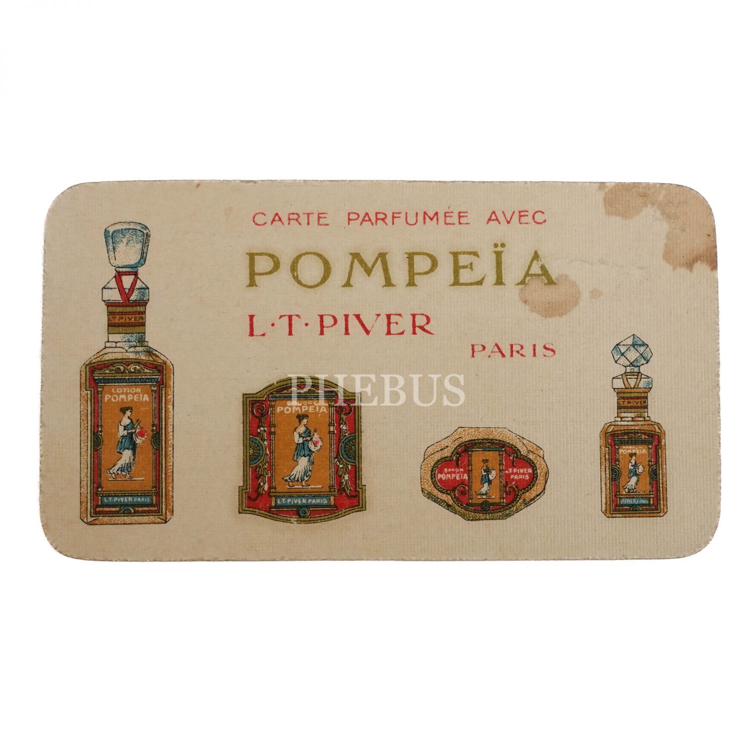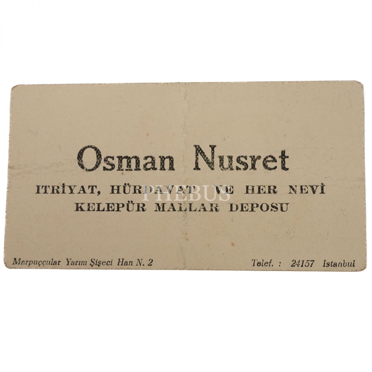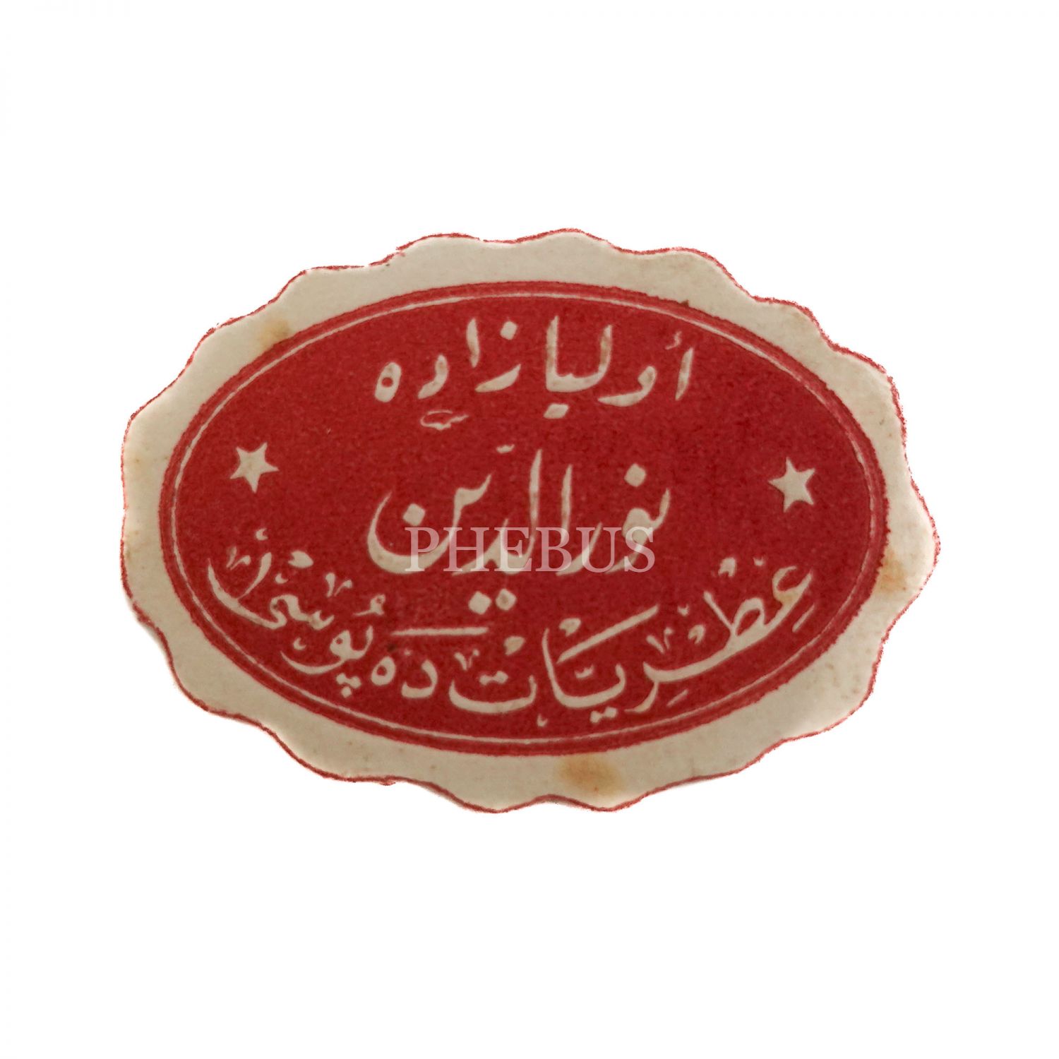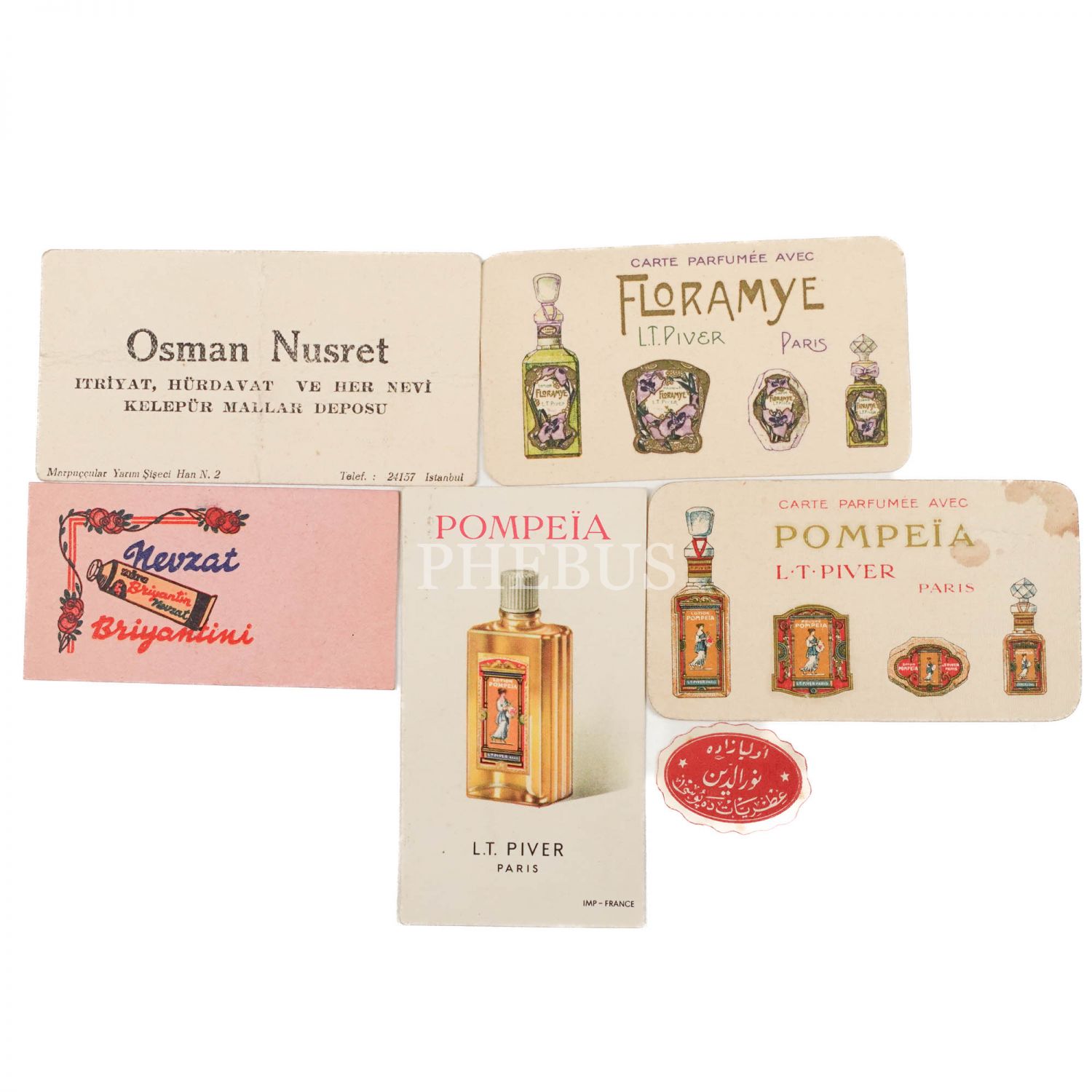 "Pompeia" losyon markasının Arapça ve Fransızca reklam kartı, Nevzat Briyantini reklam kartı, Floramye losyonunun Fransızca reklam kartı, "Divinia" reklamlı Osman Nusret Itriyat, Hürdavat ve Her Nevi Kalepür Mallar Deposu´nun işyeri kartı ve Osmanlıca Evliyazade Nureddin Itriyat Deposu´nun etiketi...