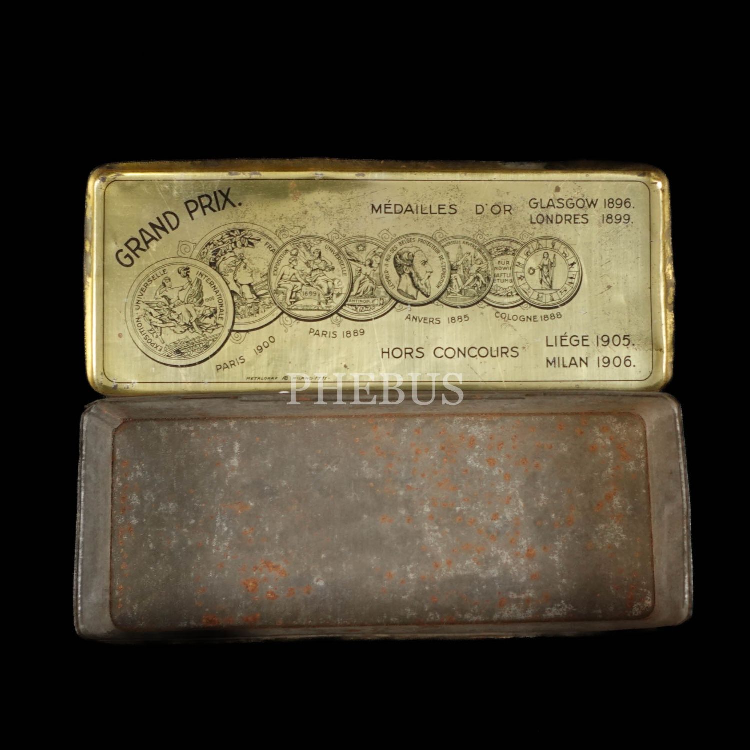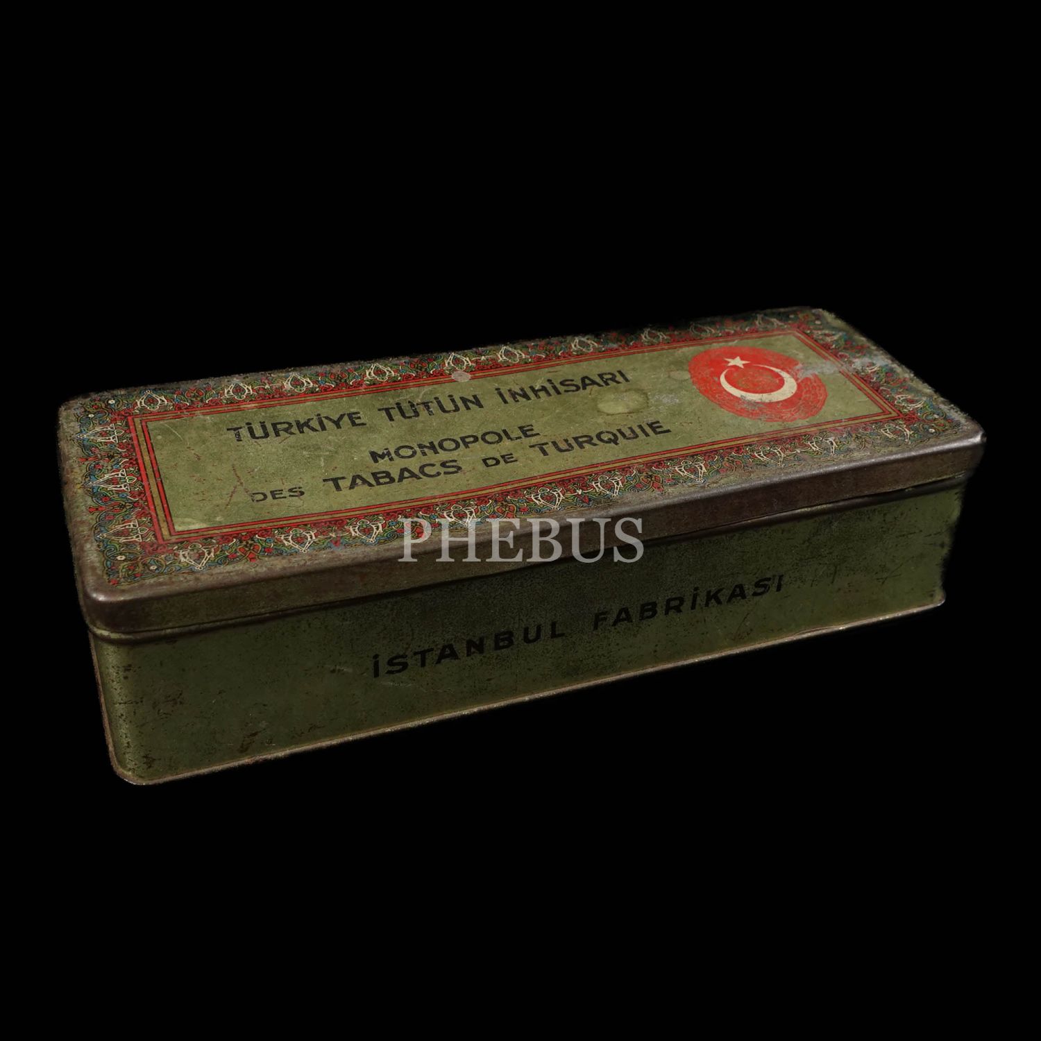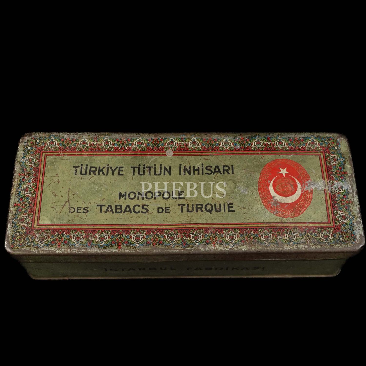Türkçe-Fransızca yazılı Türkiye Tütün İnhisarı teneke kutusu, "Monopole des Tabacs de Turquie", 19x8x5 cm...