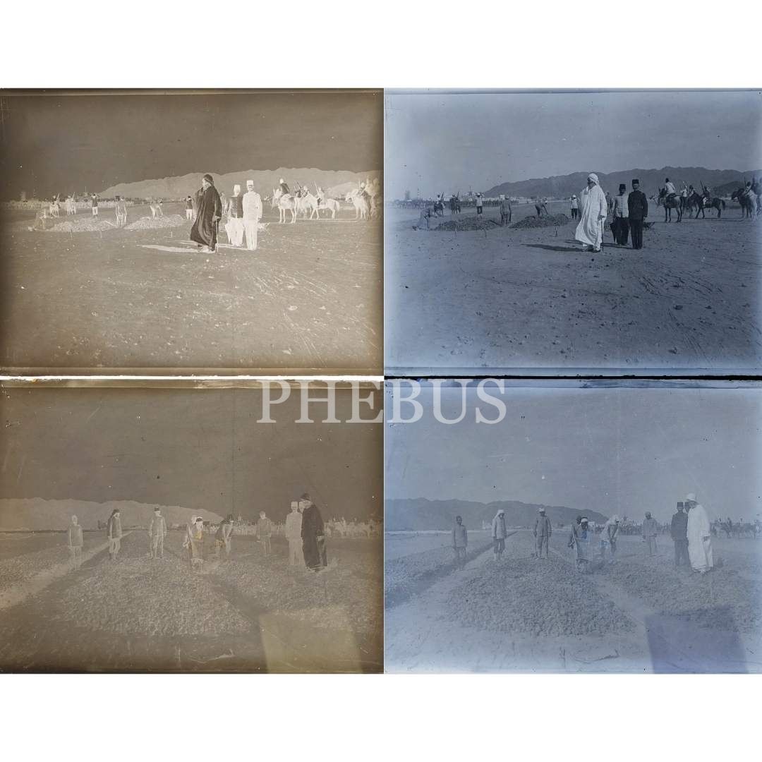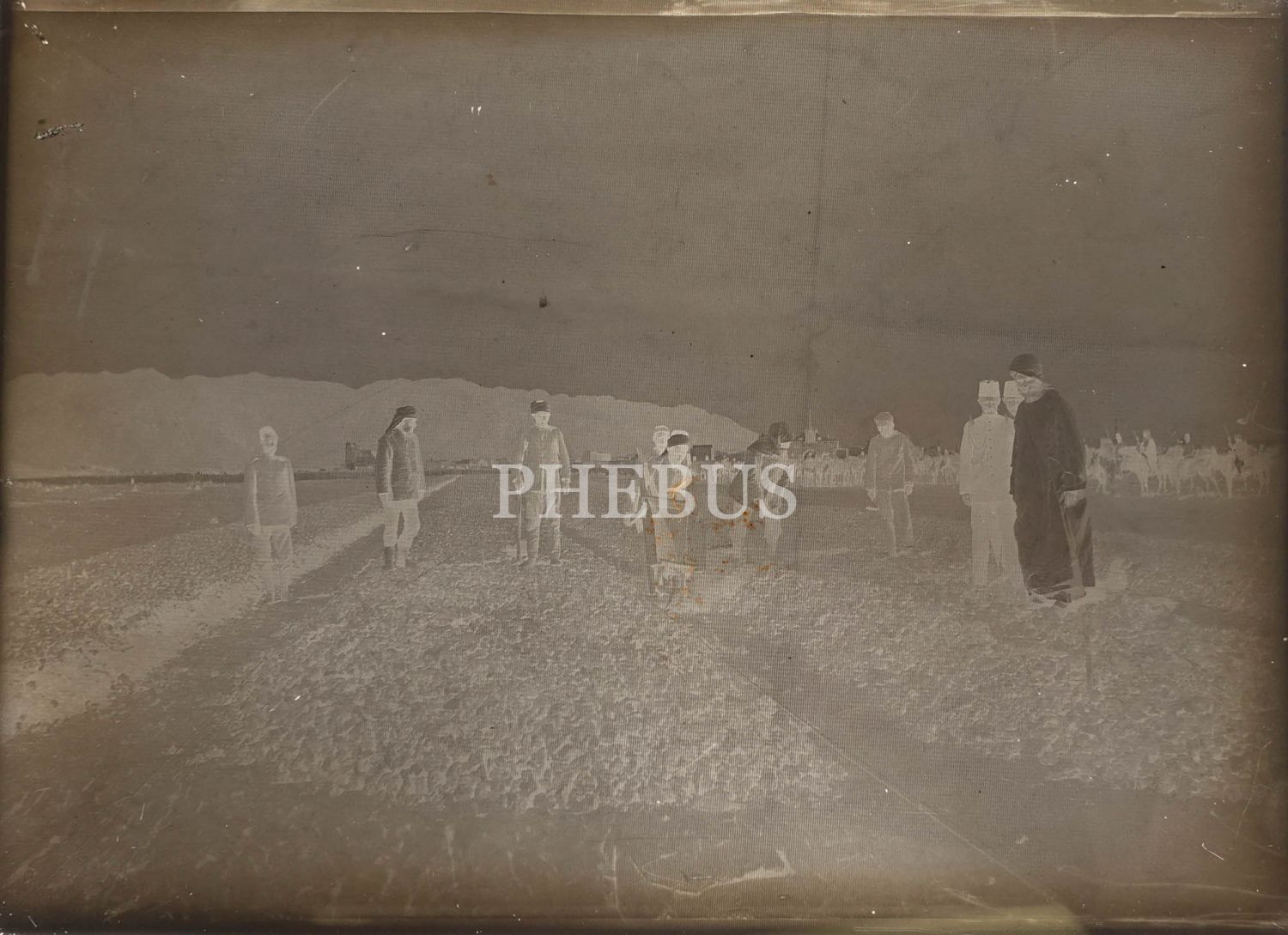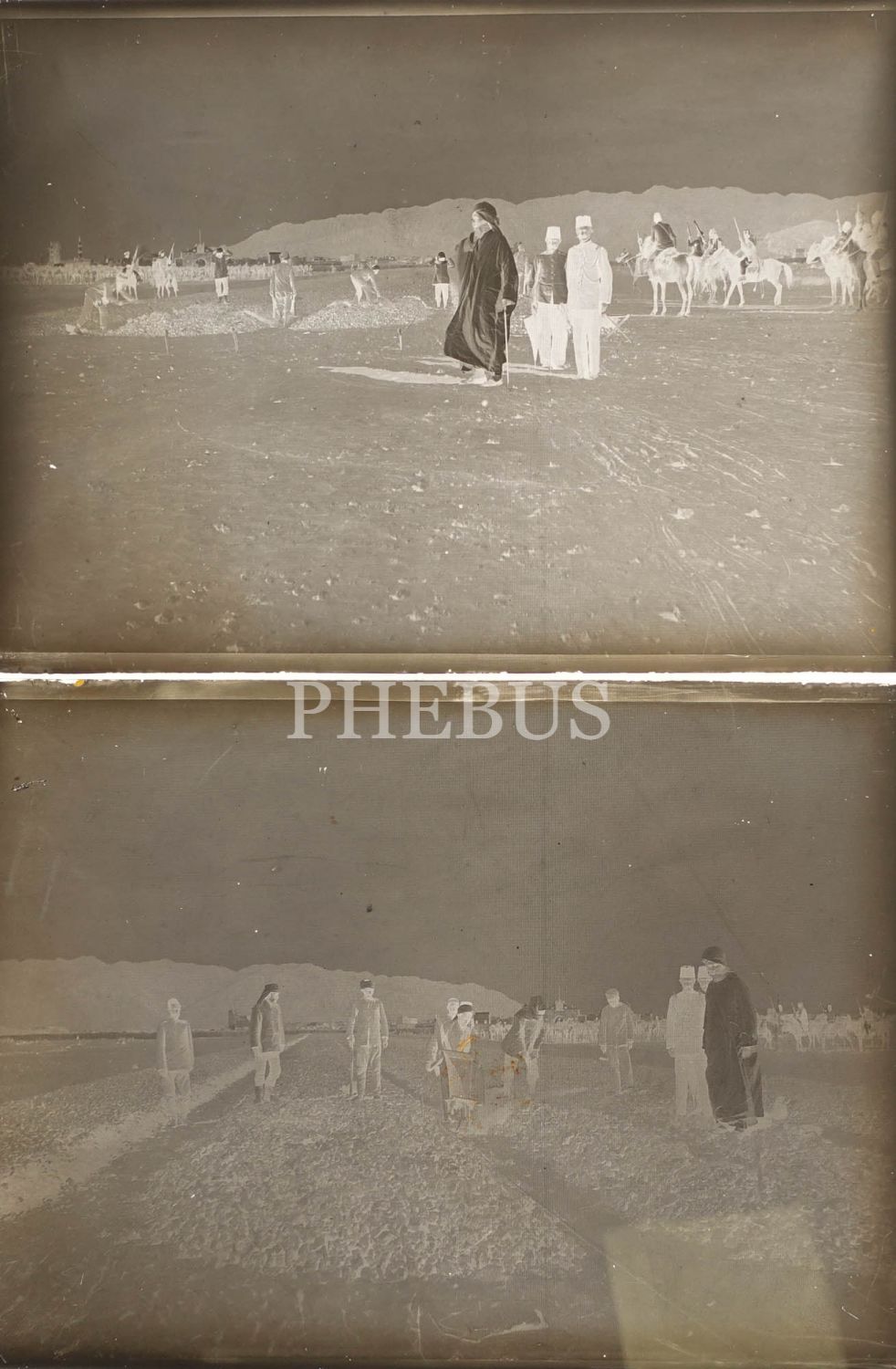Bir Doğu cephesinde Türk birliğini ve mıntıka çalışmalarını teftiş eden yöresel kıyafetli beyefendinin iki adet cam negatif fotoğrafı, etraftaki tüfekli süvariler dikkat çekmektedir, 8x13 cm...