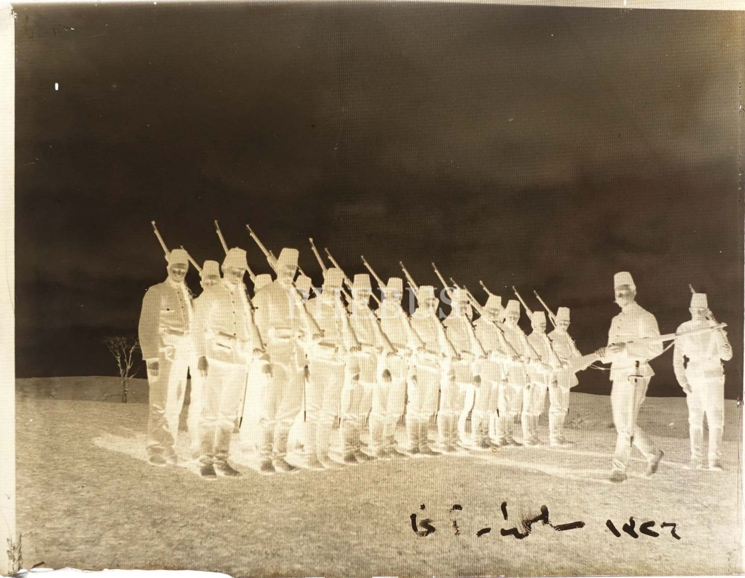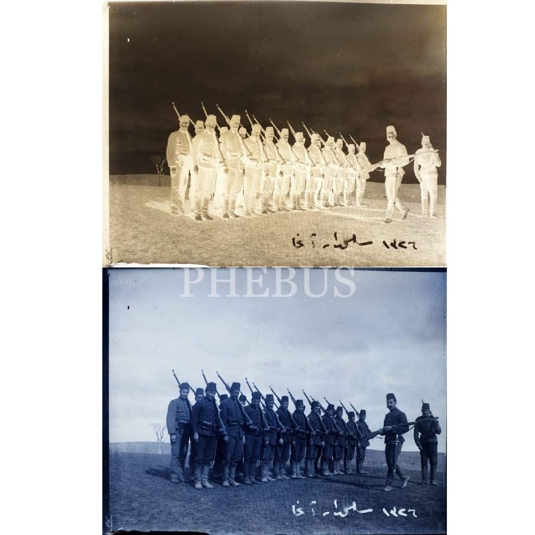 Tüfek kullanma eğitimi alan bir grup Türk askerinin cam negatif fotoğrafı, negatif üzerine Osmanlıca "Silahtarağa - 1326" notu düşülmüştür, 12x9 cm...