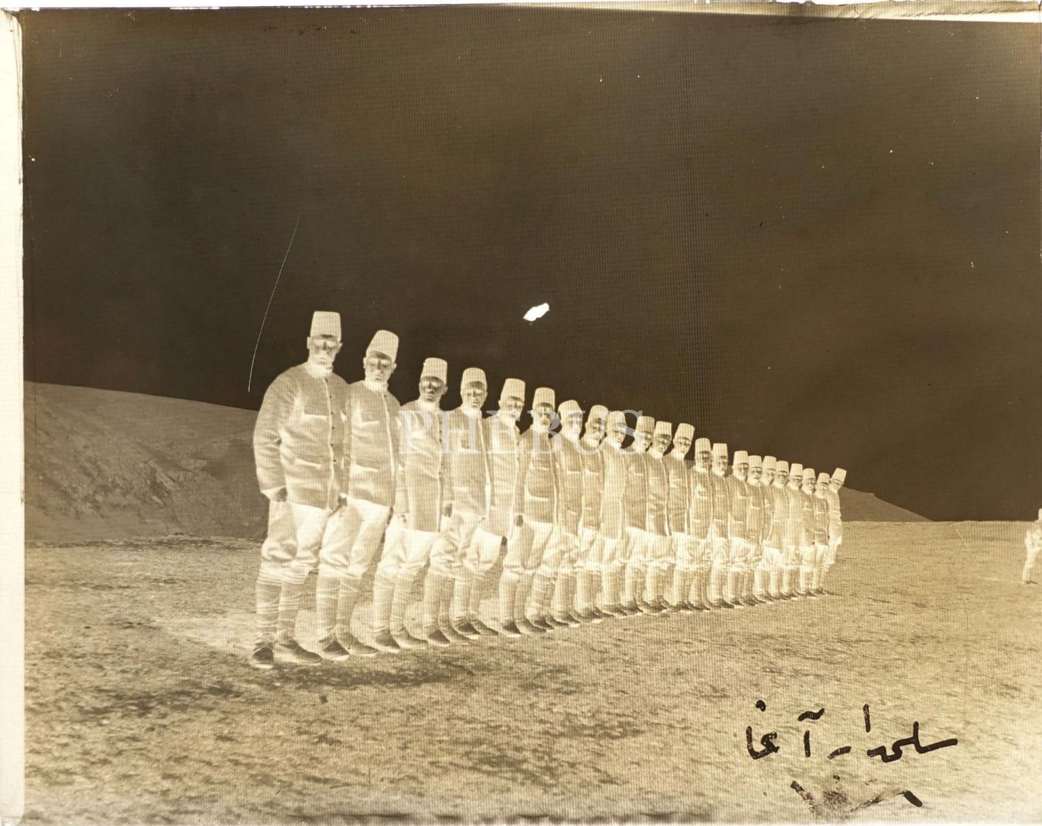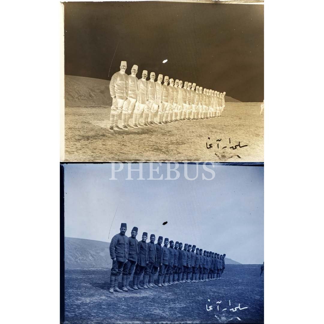 Eğitim için toplanmış bir grup Türk askerinin cam negatif fotoğrafı, negatif üzerine Osmanlıca "Silahtarağa" notu düşülmüştür, 12x9 cm...