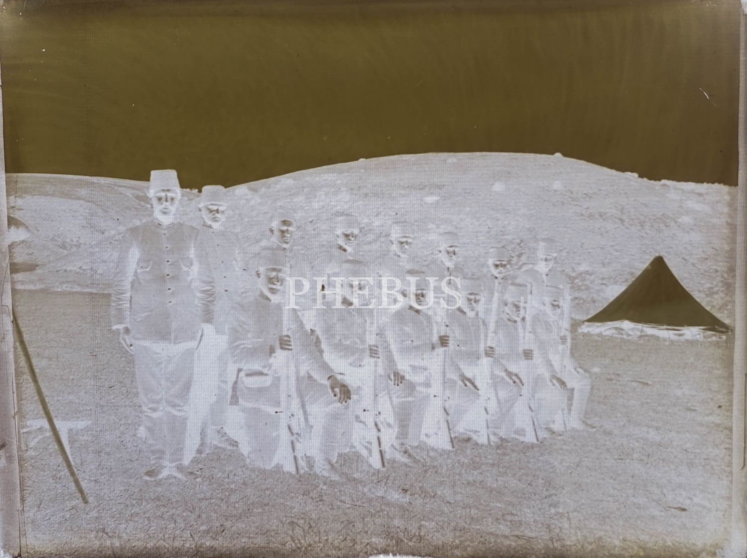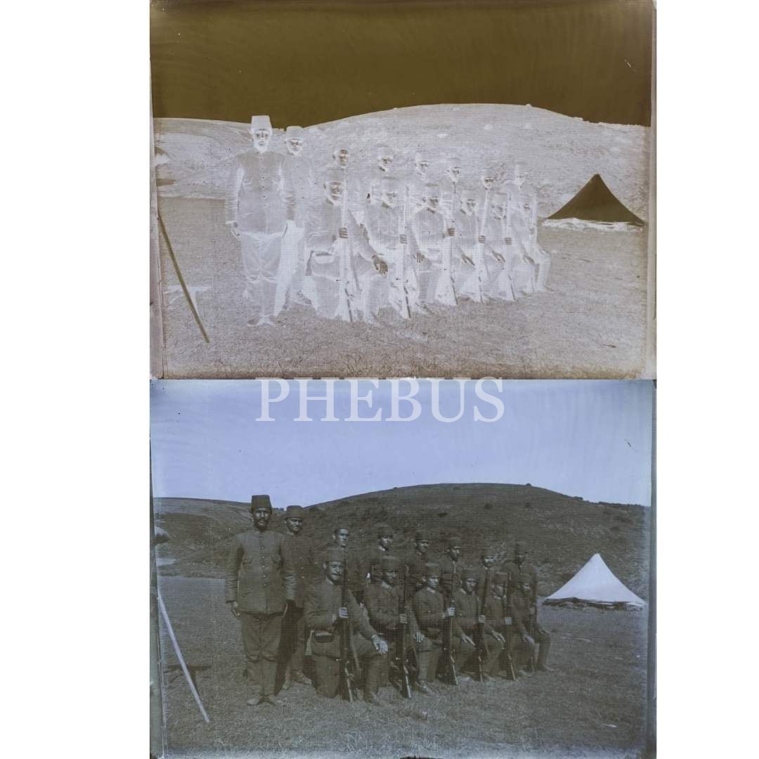 Kırsal alana kurdukları ordugahta, ellerinde tüfekleriyle poz veren bir grup Türk askerinin cam negatif fotoğrafı, 12x9 cm...
