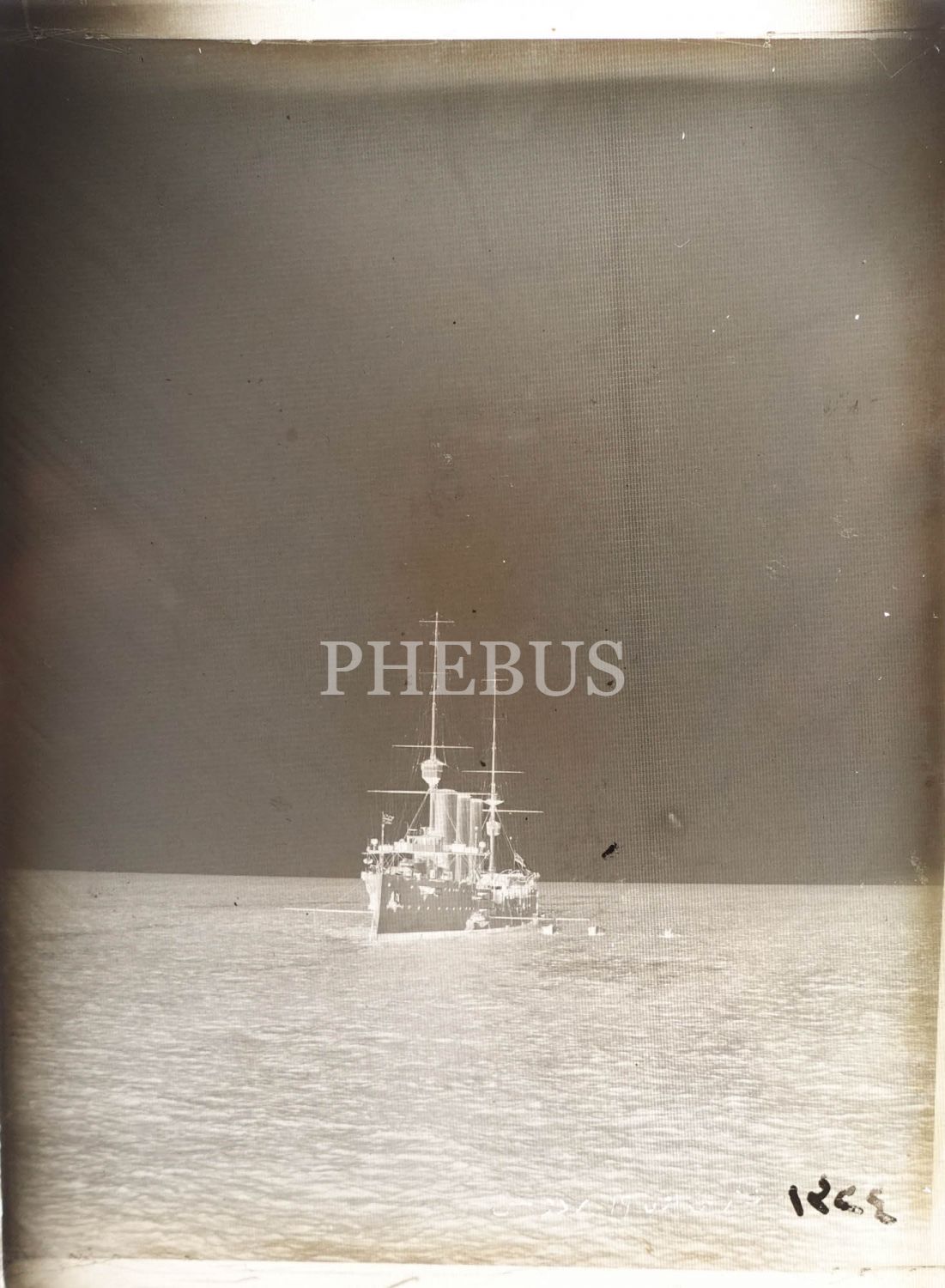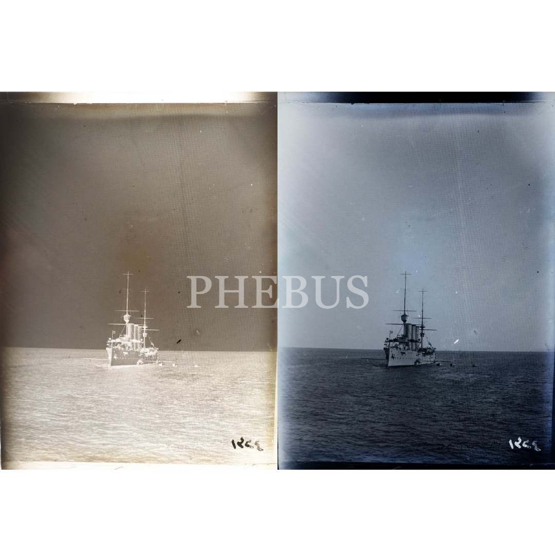 Rodos açıklarında seyreden bir İngiliz gemisinin cam negatif fotoğrafı, negatif üzerine Osmanlıca "19 Teşrinievvel 1324 Rodos" notu düşülmüştür, 9x12 cm...